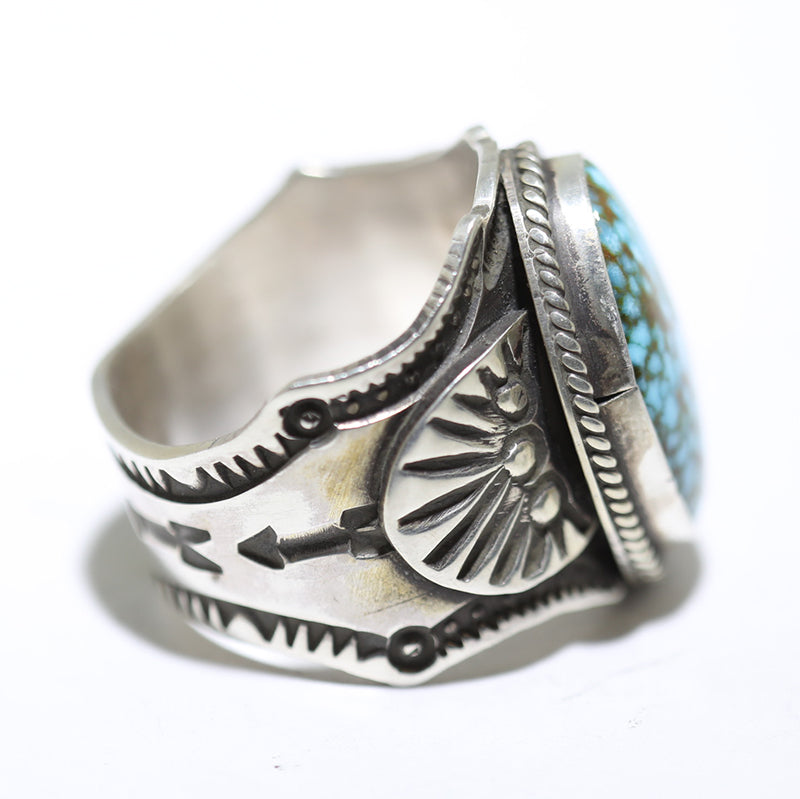 Sterling silver ring features beautiful silverwork with hand stamped designs and is set with Stabilized Kingman Turquoise which is surrounded by twist wire.