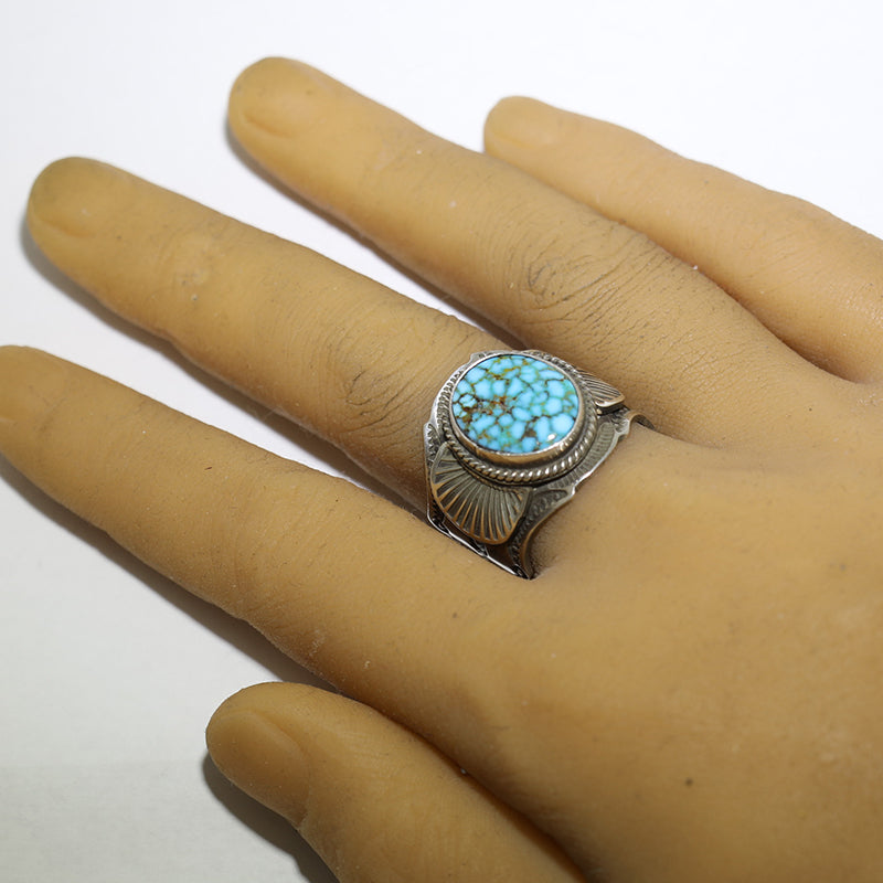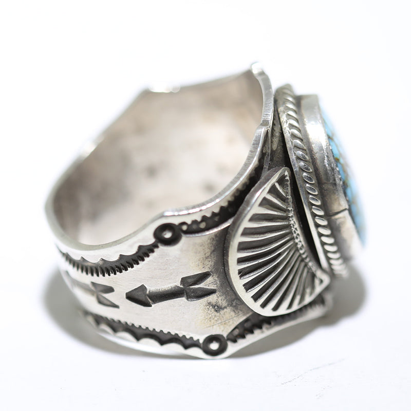 Sterling silver ring features beautiful silverwork with hand stamped designs and is set with Stabilized Kingman Turquoise which is surrounded by twist wire.