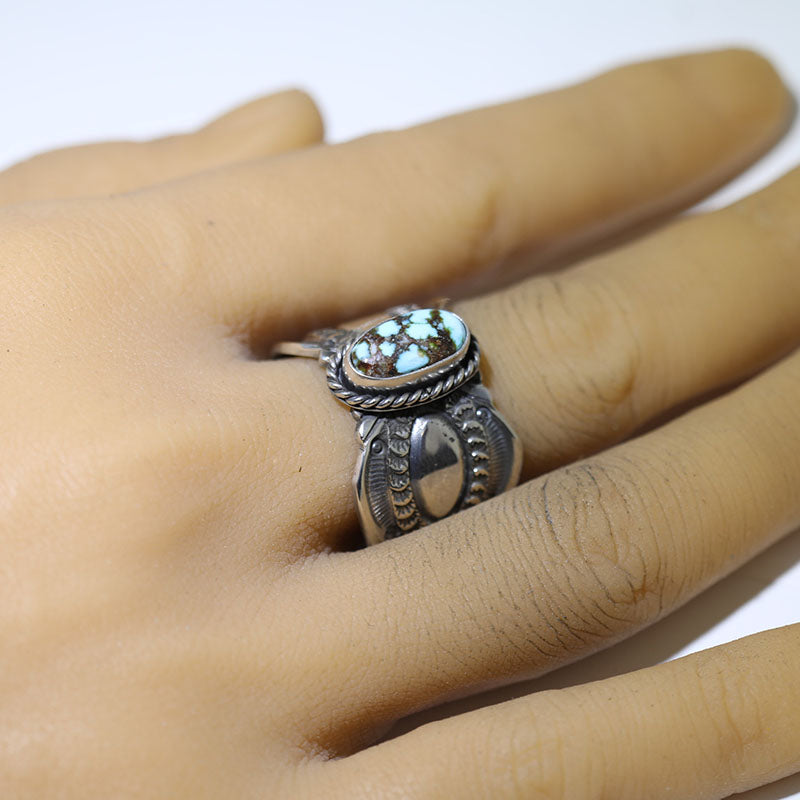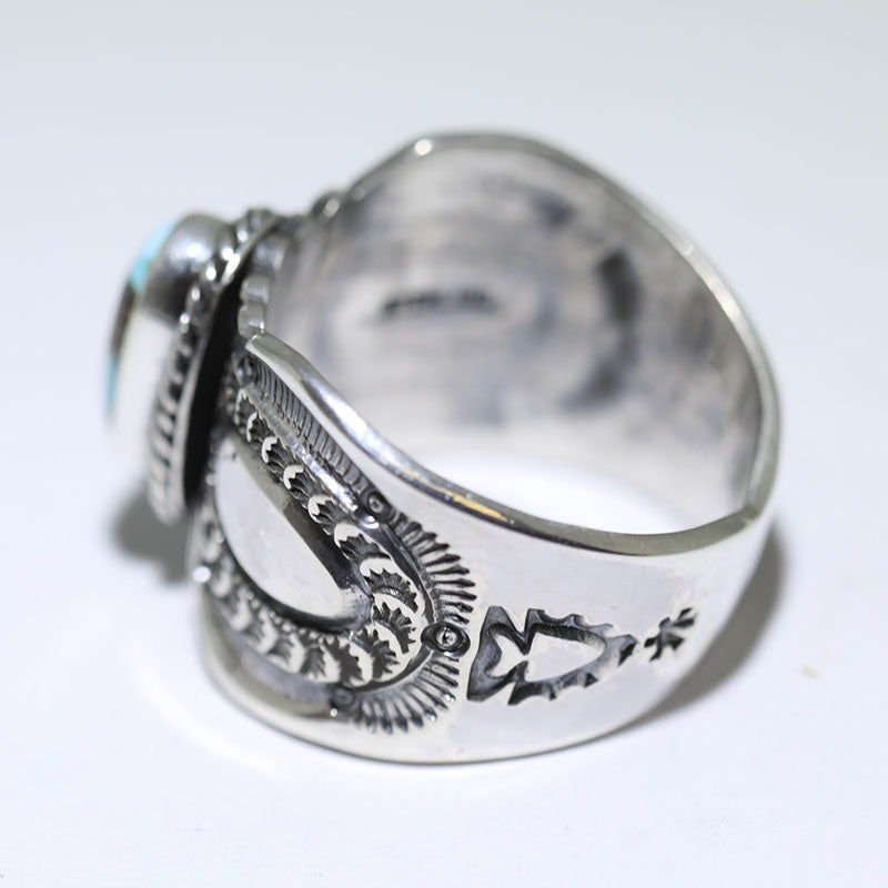 Sterling silver ring features hand stamped designs and is set with Stabilized Kingman Turquoise.