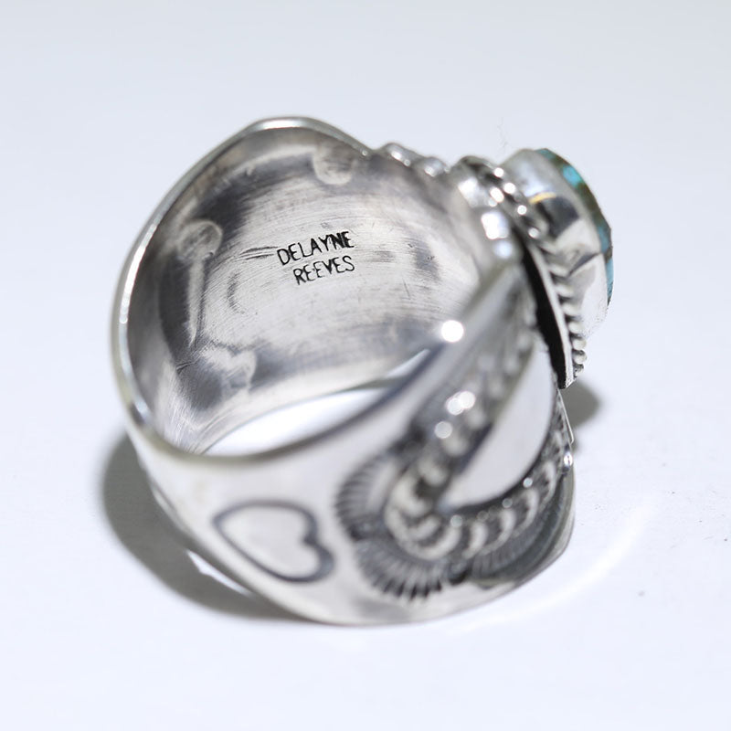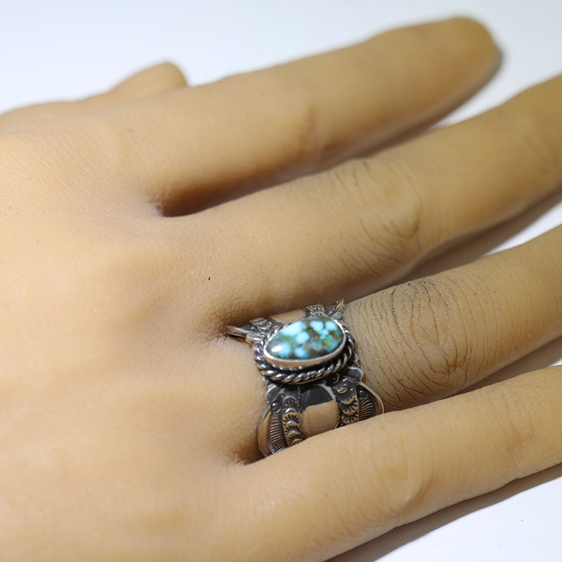 Sterling silver ring features hand stamped designs and is set with Stabilized Kingman Turquoise.