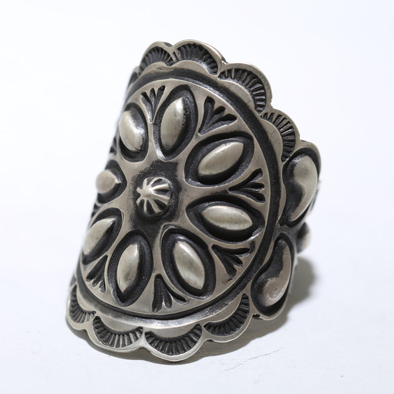 Sterling silver ring features a concho bump out design in the center with a starburst in the middle. This ring has hand stamped designs and bump out patterns that go along the band.