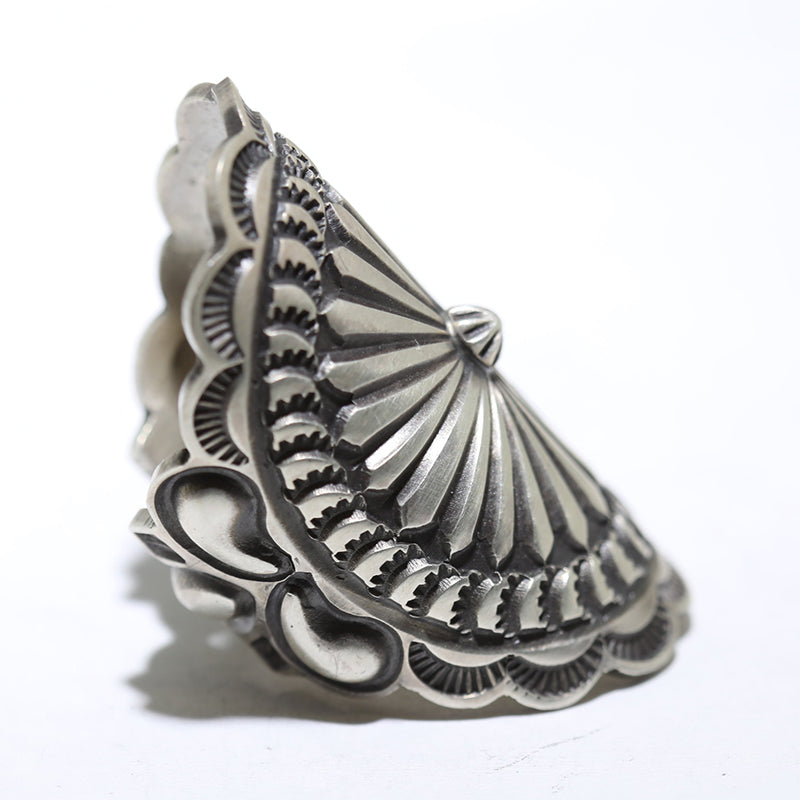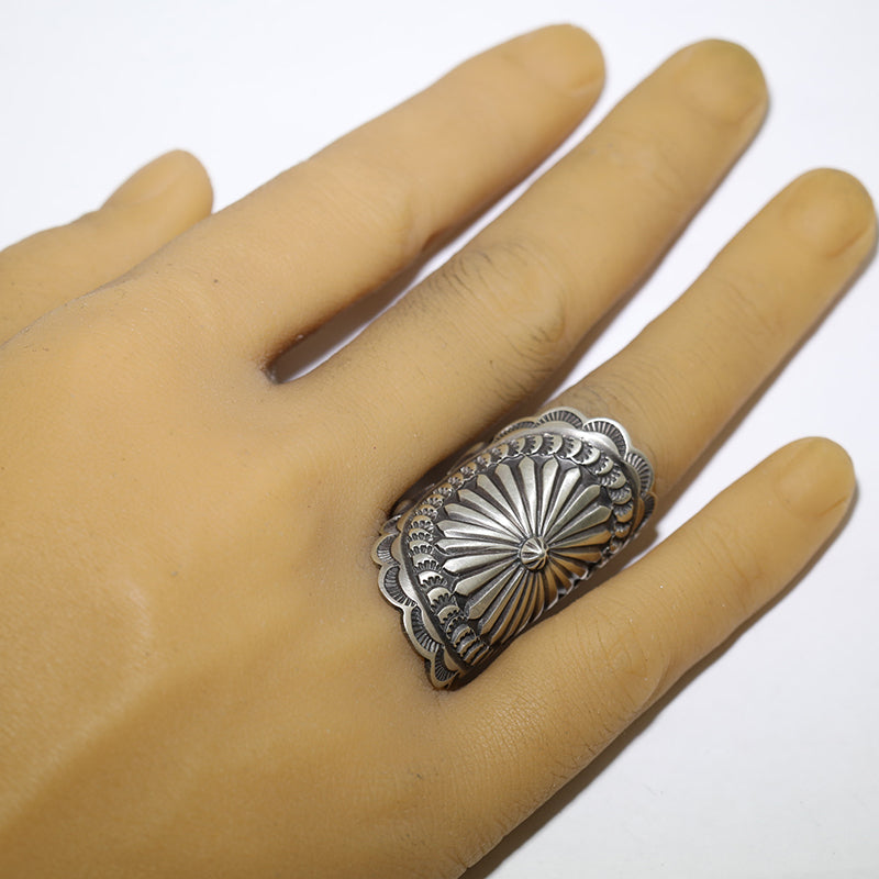 Sterling silver ring features a hand stamped concho design in the center with a starburst in the middle and bump out patterns along the band.