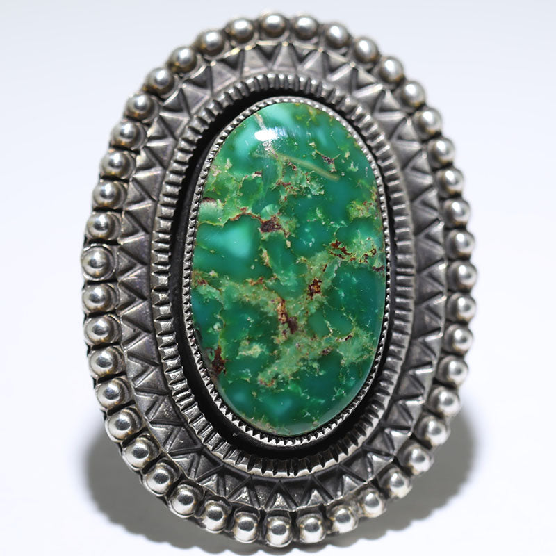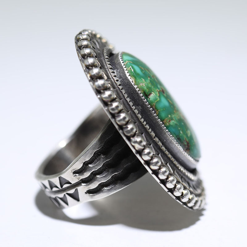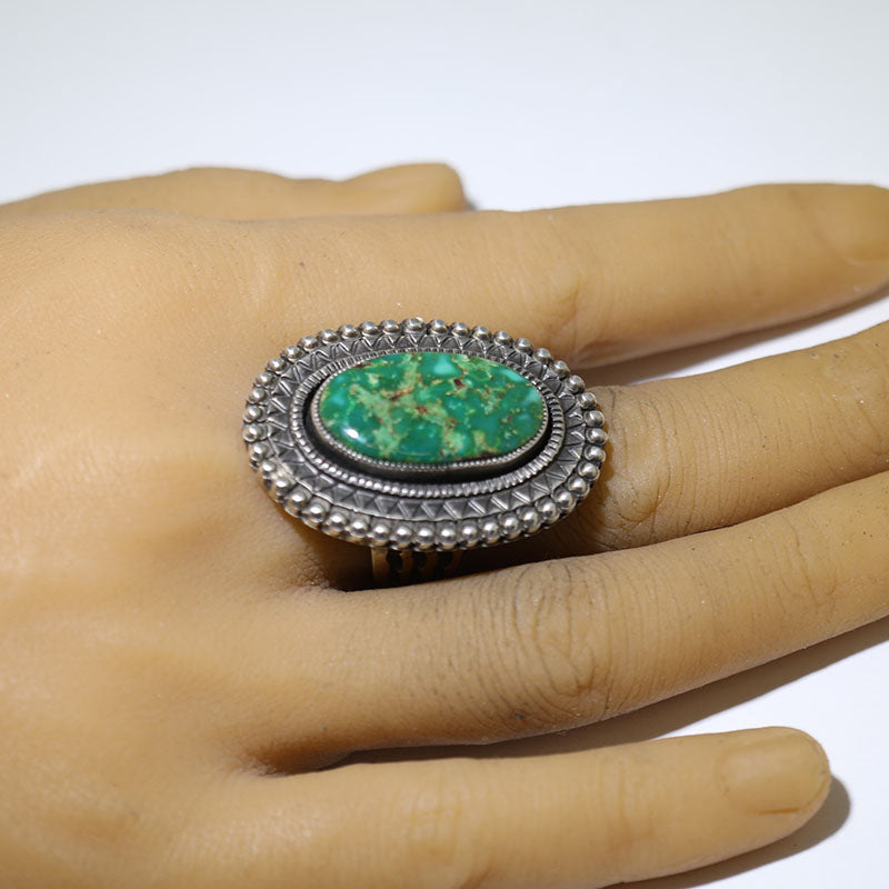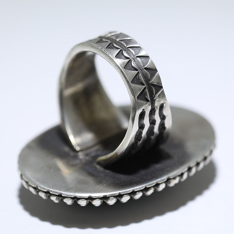Beautiful sterling silver ring is set with a large Stabilized Sonoran Gold Turquoise stone which is surrounded by a silver frame of hand stamped silver and silver beads on the outside.