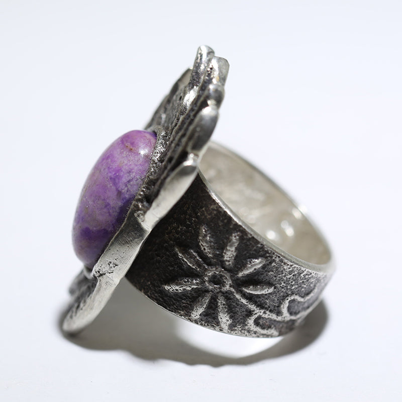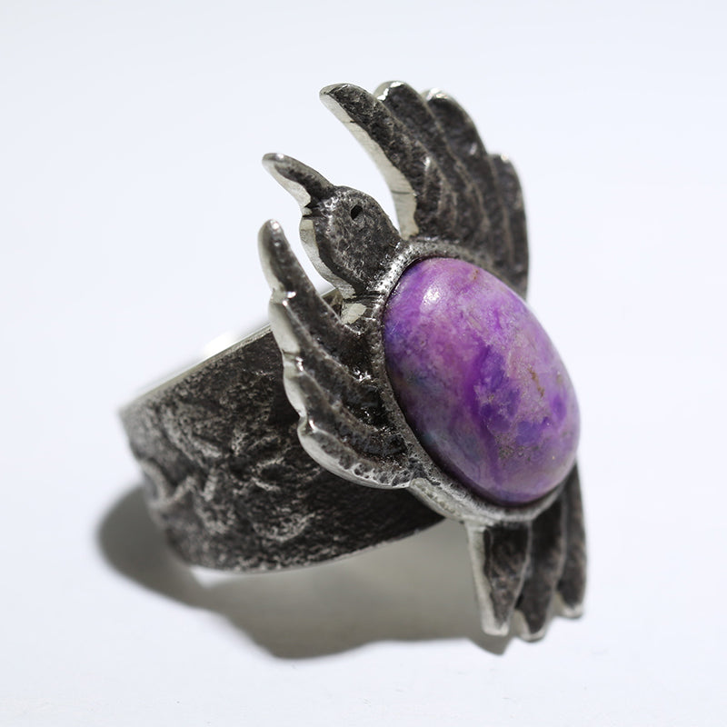 Sterling silver ring features a bird design and is set with Sugilite stone with designs along the band.