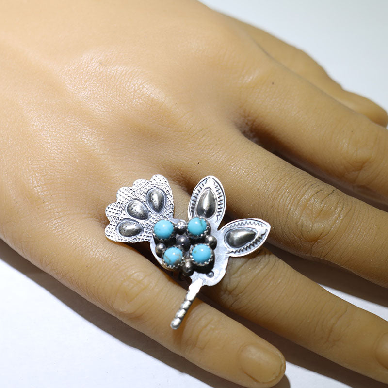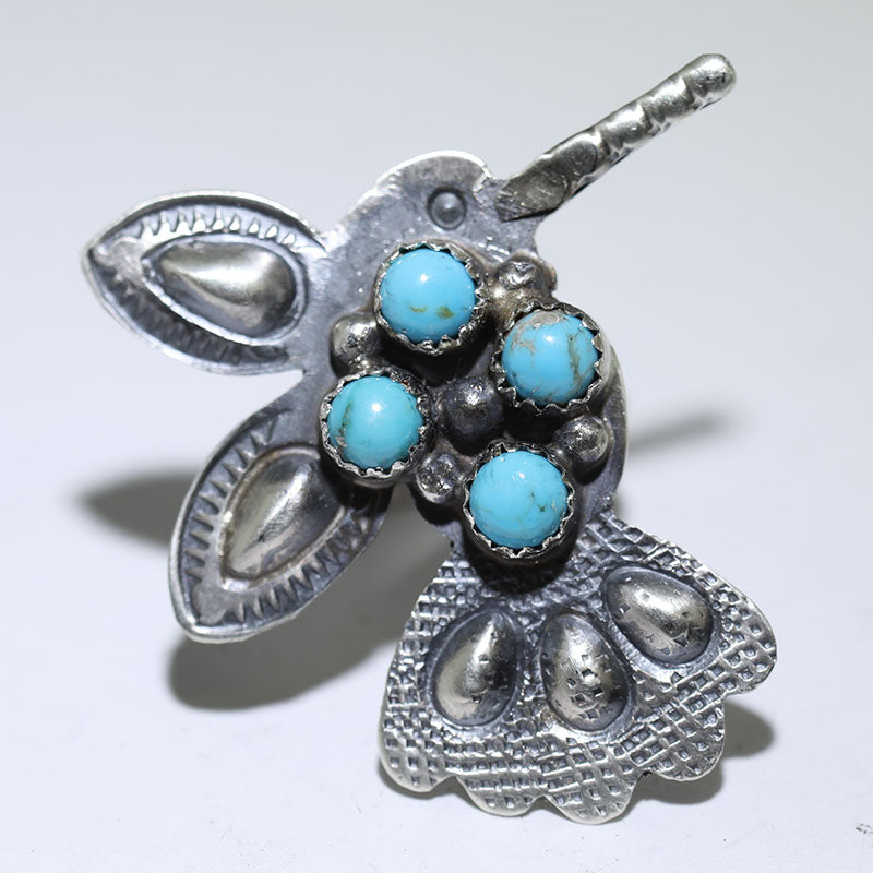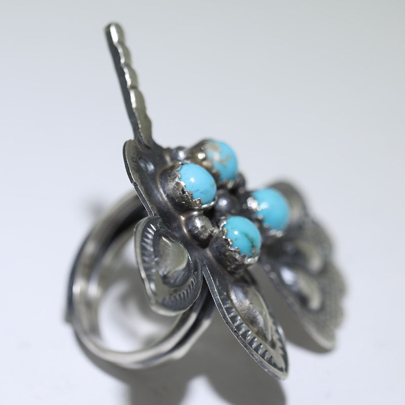 Sterling silver ring is shaped like a Hummingbird and is set with four Turquoise stones on the body.