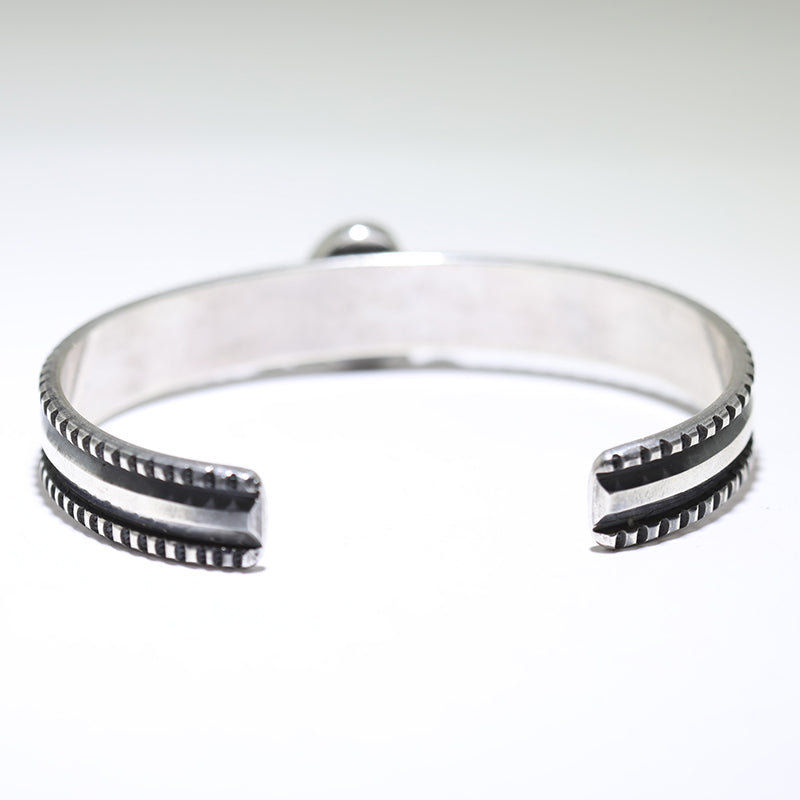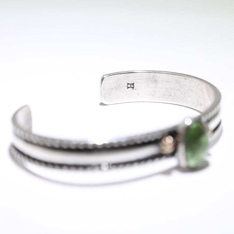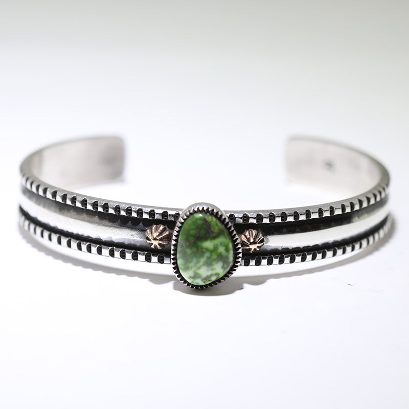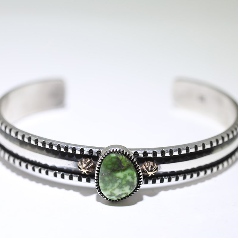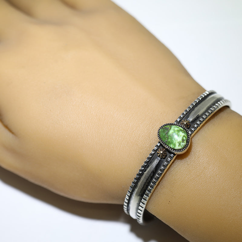 Sterling silver bracelet features shiny silver in the center with hand stamped edges and is set with Carico Lake Turquoise. A 14-Karat gold starburst sits on each side of the stone.