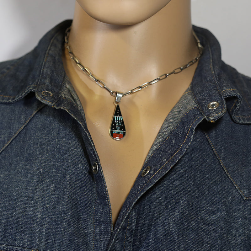 Beautiful sterling silver pendant is done in the micro-Inlay design and depicts the Yei Bi Chei in the night ceremony theme.