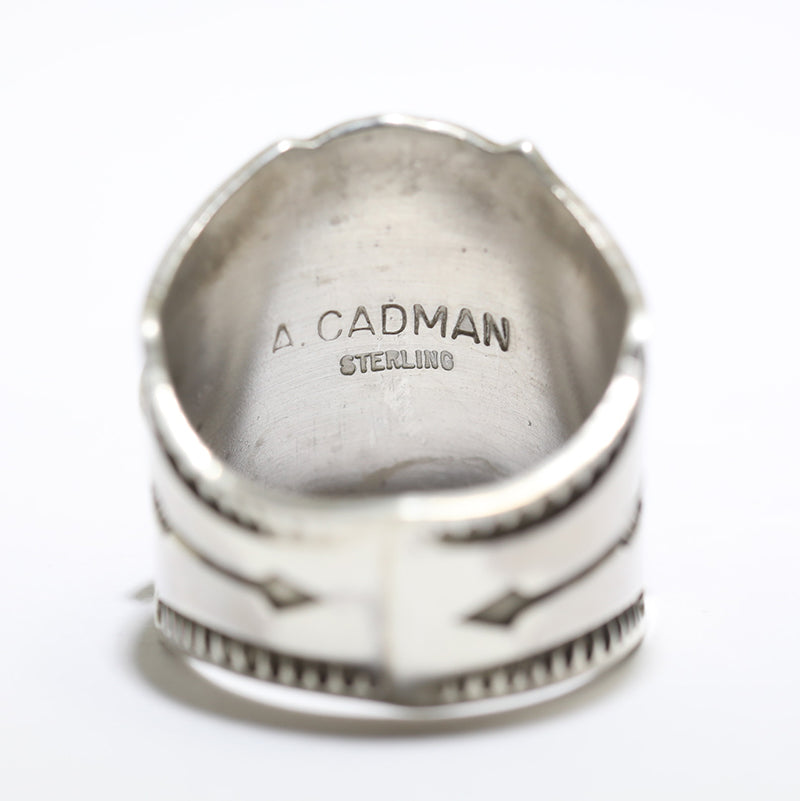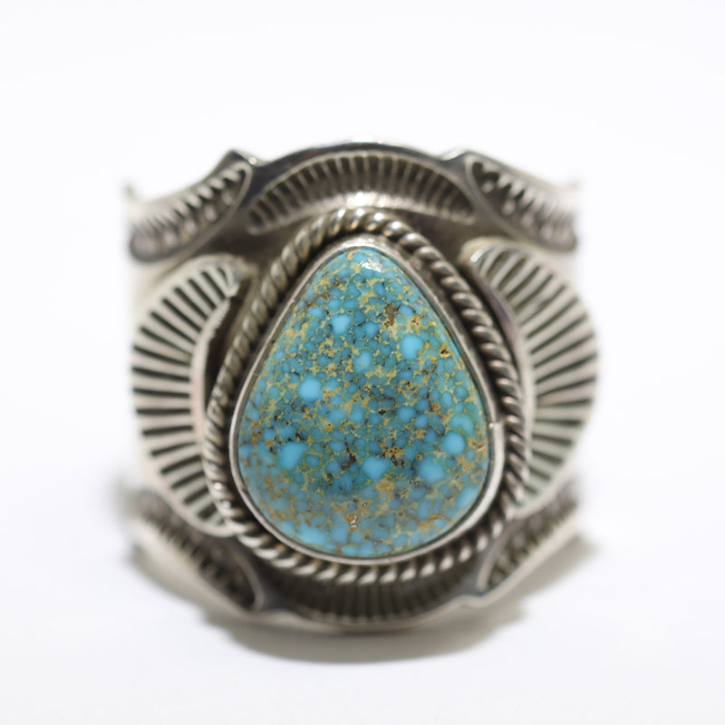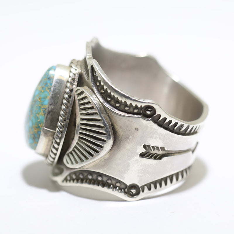Sterling silver ring features beautiful silverwork with hand stamped designs and is set with Natural Morenci Turquoise which is surrounded by twist wire.