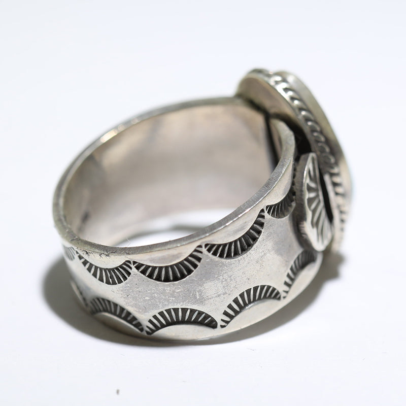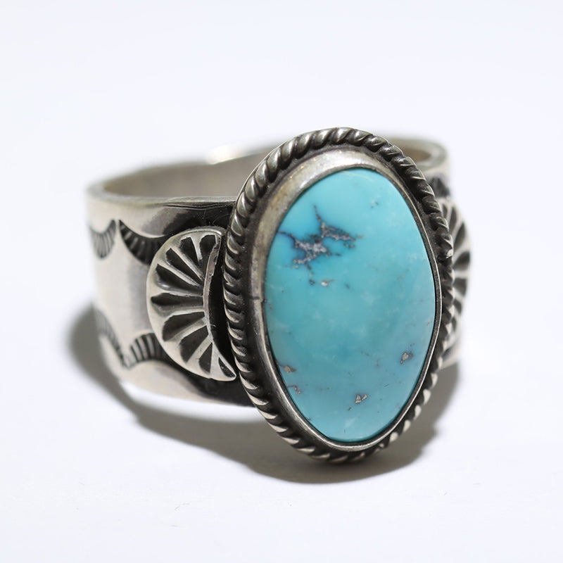 Sterling silver ring features beautiful silverwork with hand stamped designs and is set with Natural Morenci Turquoise which is surrounded by twist wire.