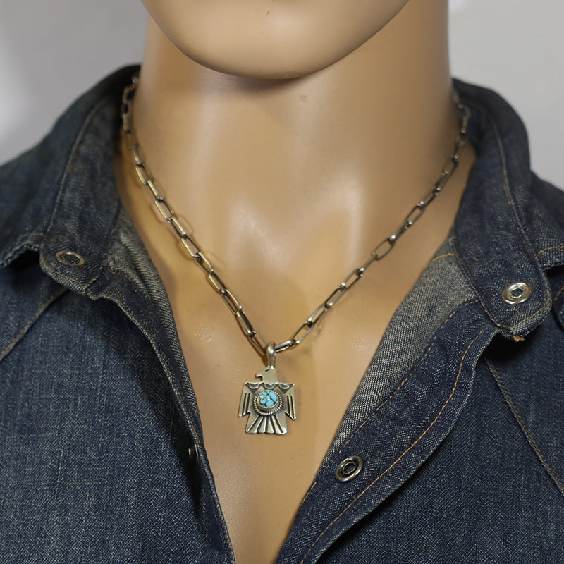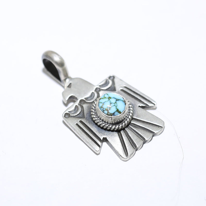 Sterling silver Thunderbird pendant features hand stamped designs and is set with Natural Number Eight Turquoise.