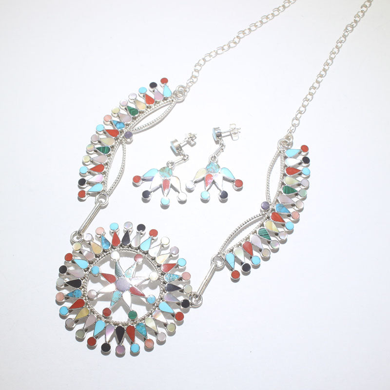 Beautiful sterling silver inlay necklace in multi color stones, with a set of matching earrings. The stons are shells, turqouise, coral, and onyx.