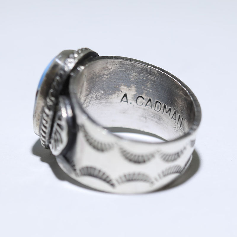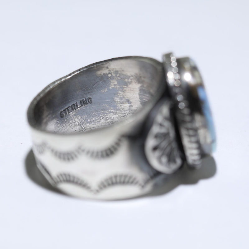 Beautiful sterling silver ring is set with Golden Hill Turquoise in the center and features hand stamped designs along the band.