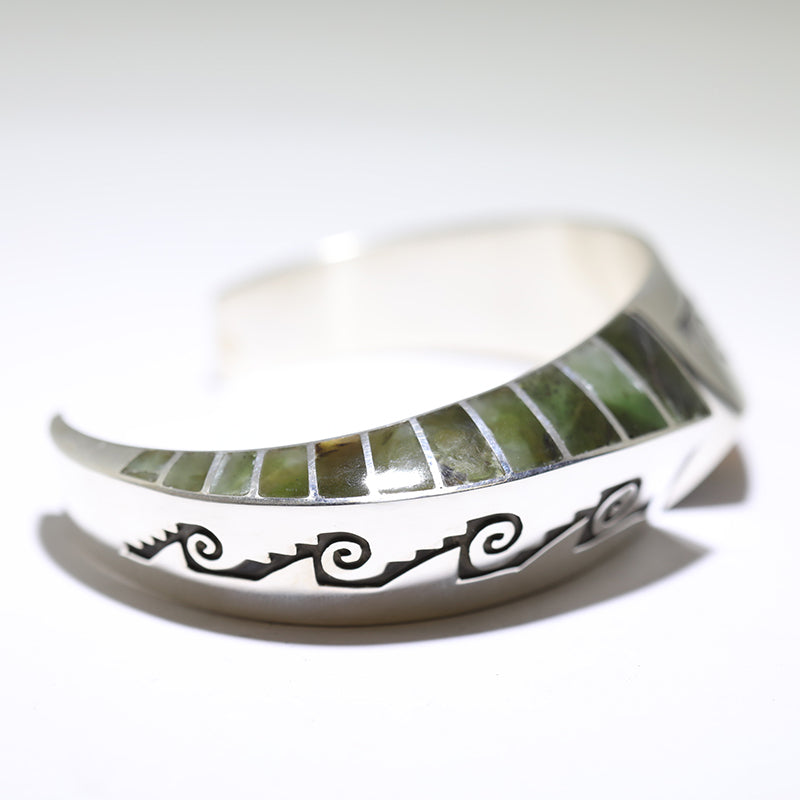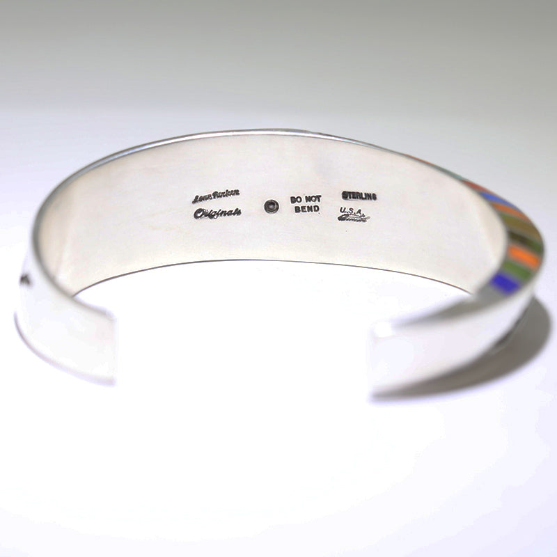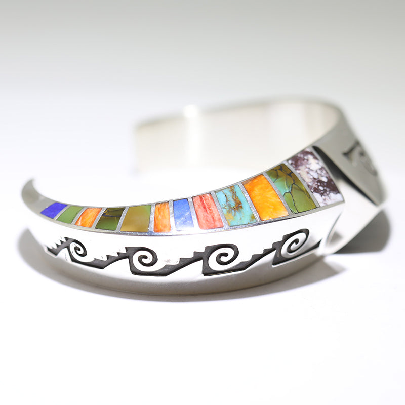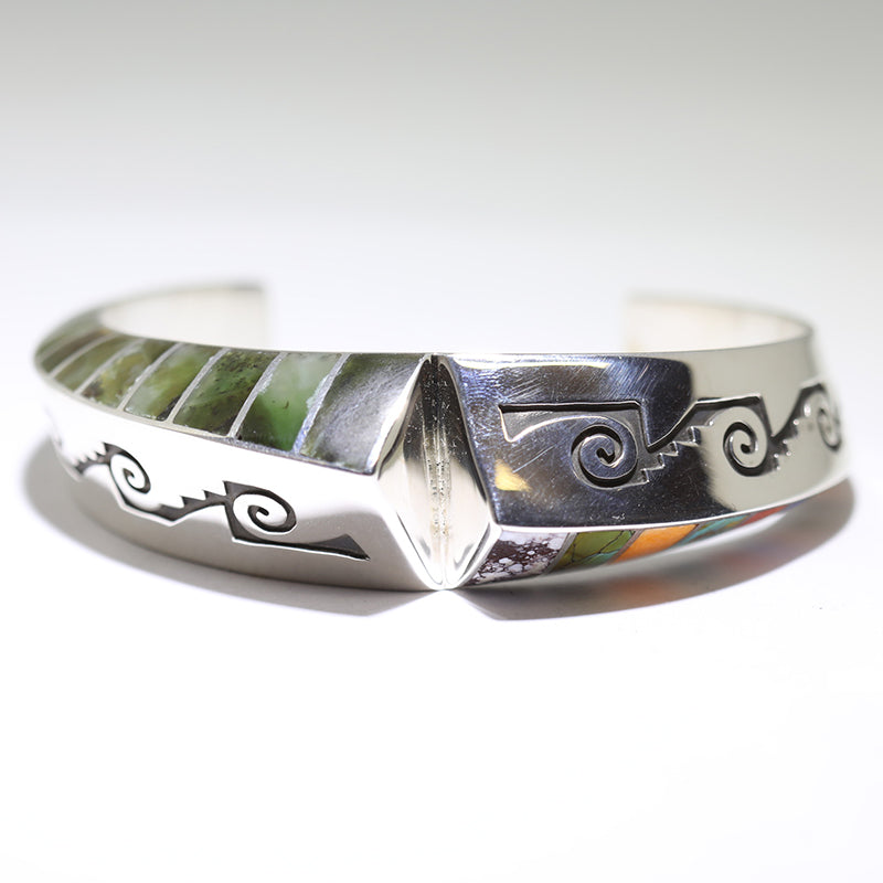 Sterling silver bracelet features overlay designs and is inlaid with Jade stones on one side and multicolored stones on the other.