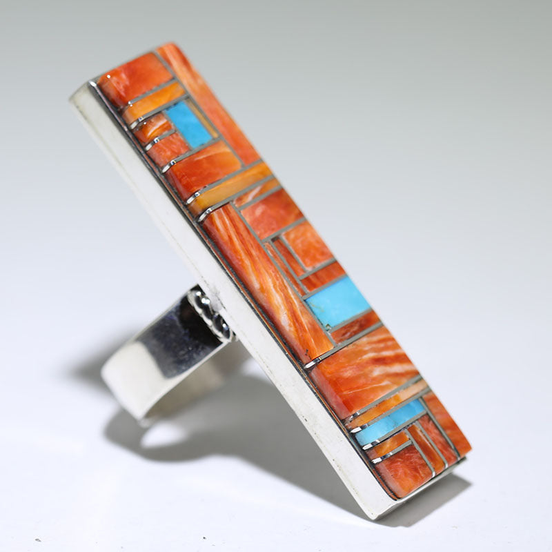 Beautiful sterling silver ring is inlaid with orange Spiney Oyster Shell with Turquoise accents and has a nice, heavy silver shank.