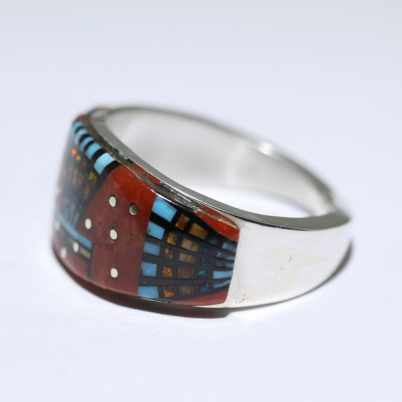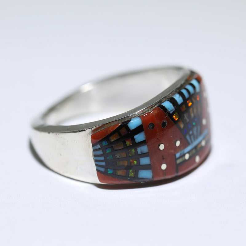 Beautiful sterling silver ring is done in the micro-Inlay design and depicts the Yei Bi Chei in the Night Ceremony on Coral background.