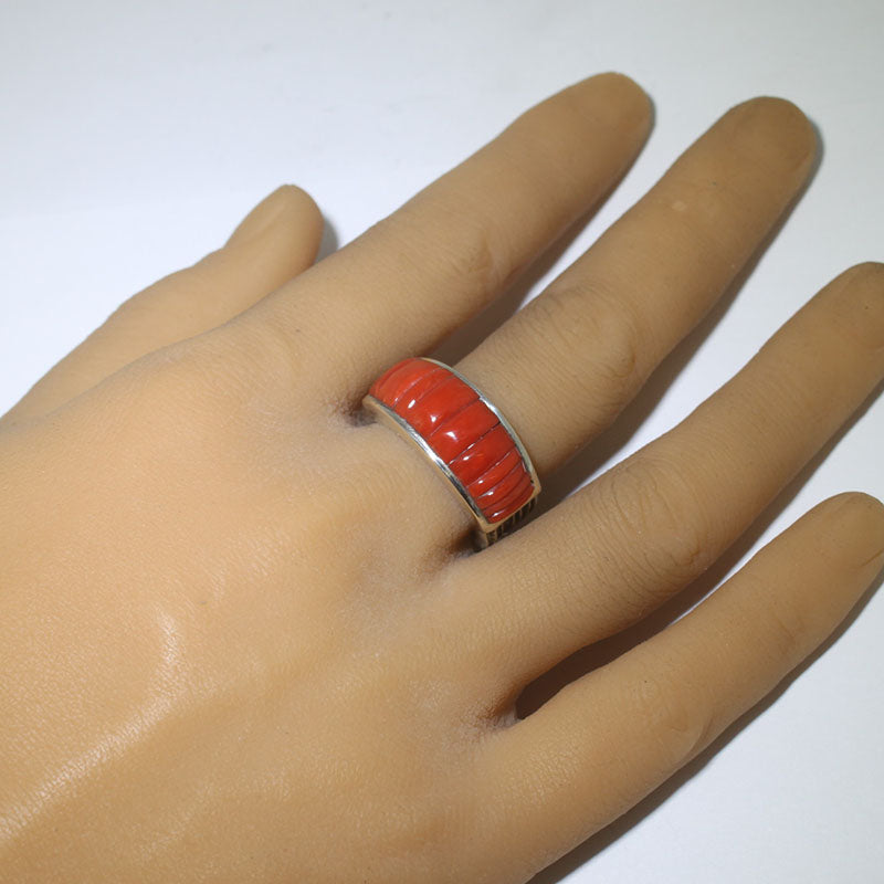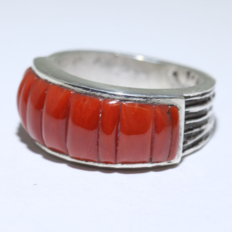 Sterling silver ring is created using the Tufa casting technique and is inlaid with coral stones.