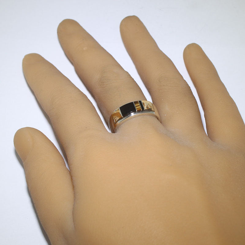 Sterling silver ring is inlaid with Onyx and Jasper.