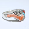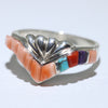 Beautiful V-shaped sterling silver ring created by Wilbert Manning. The corn row inlay is set with pink shell, lapis, coral and Chinese Turquoise.