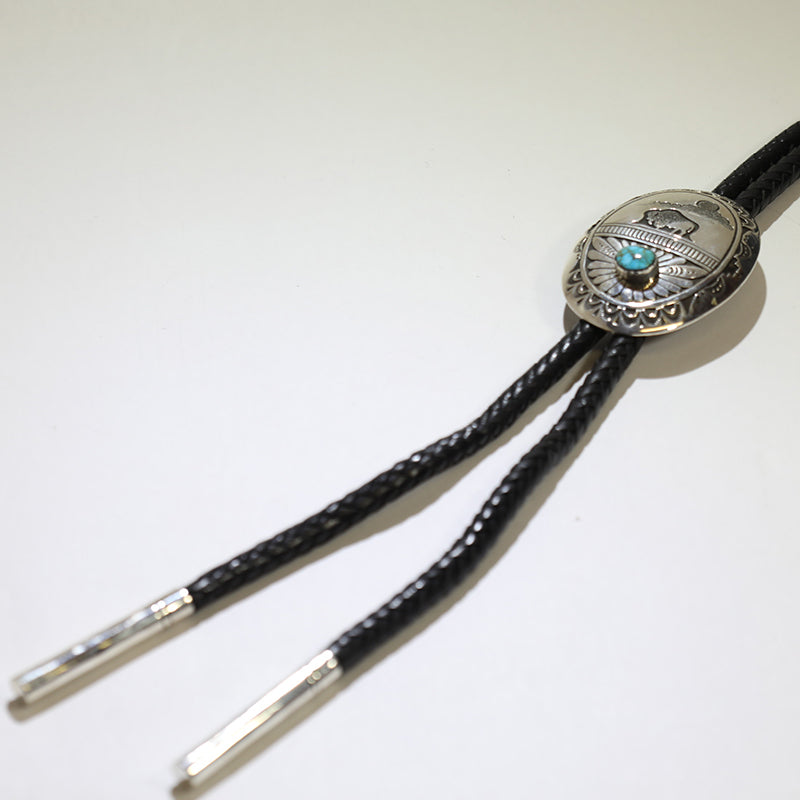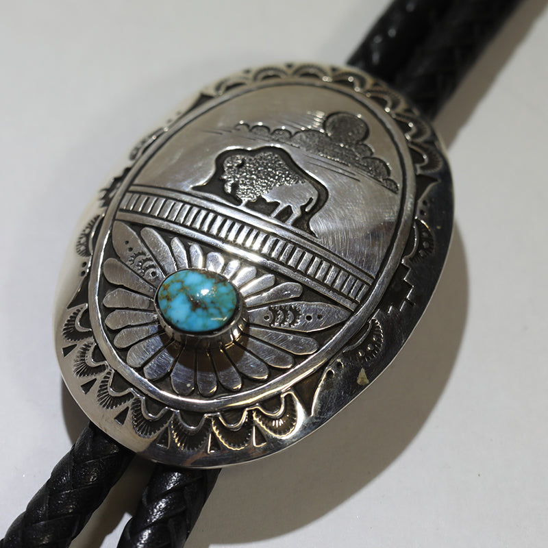 Sterling silver bolo features hand stamped and overlay designs and is set with Kingman Turquoise.