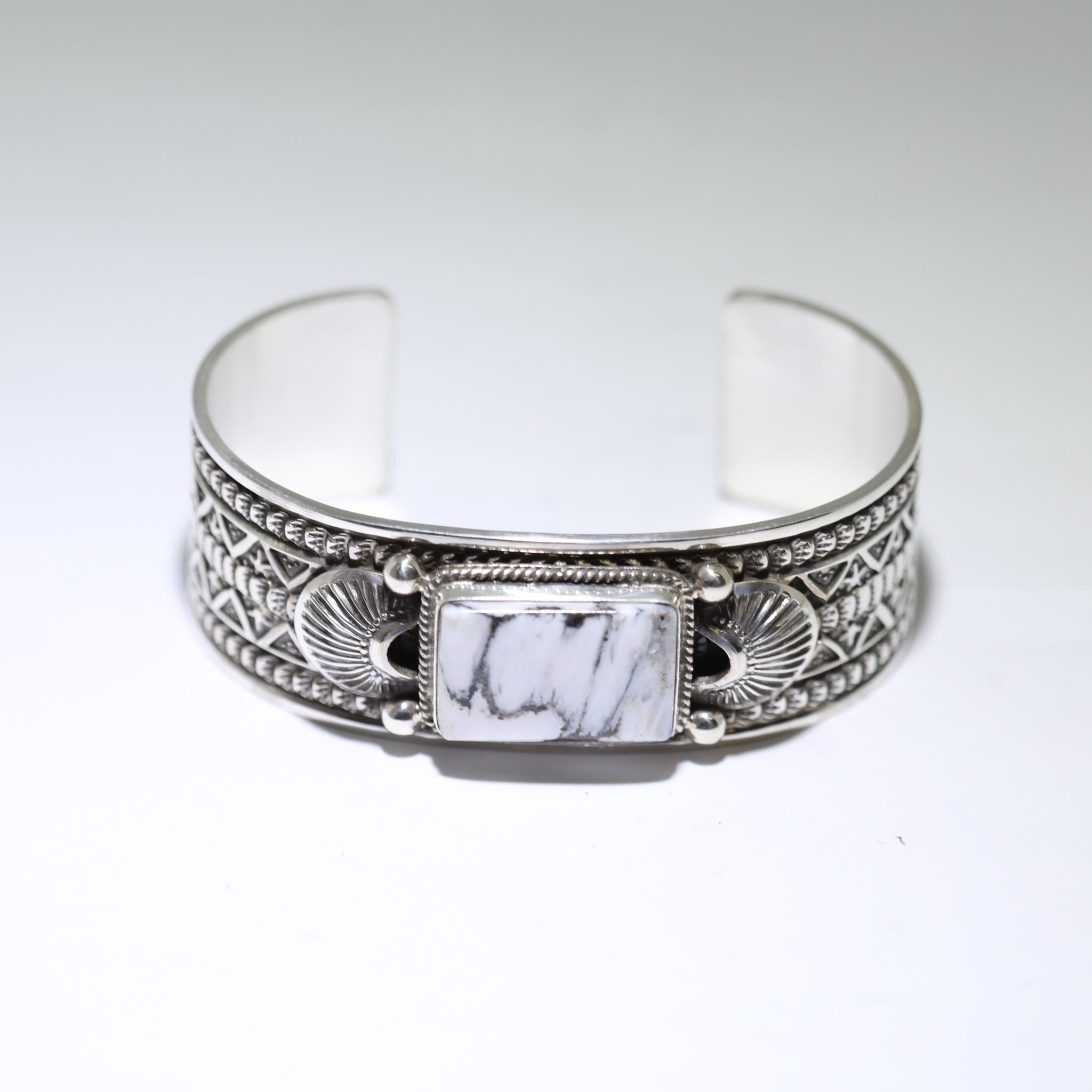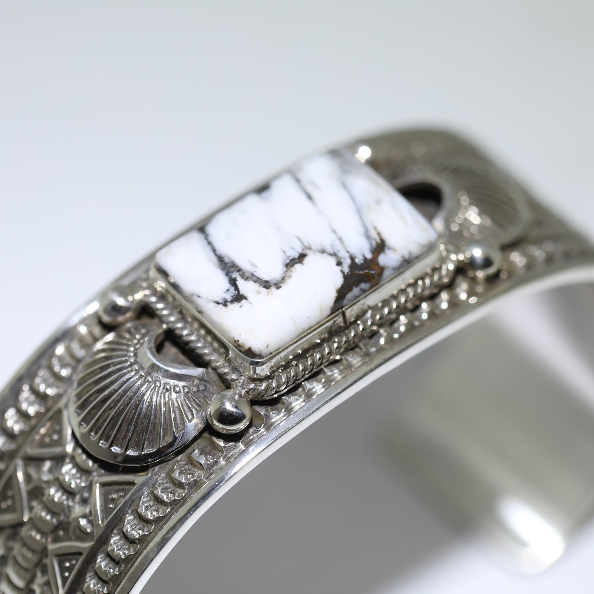 Handmade stamp Bracelet by Darrell Cadman set with White Buffalo turqouise from Nevada