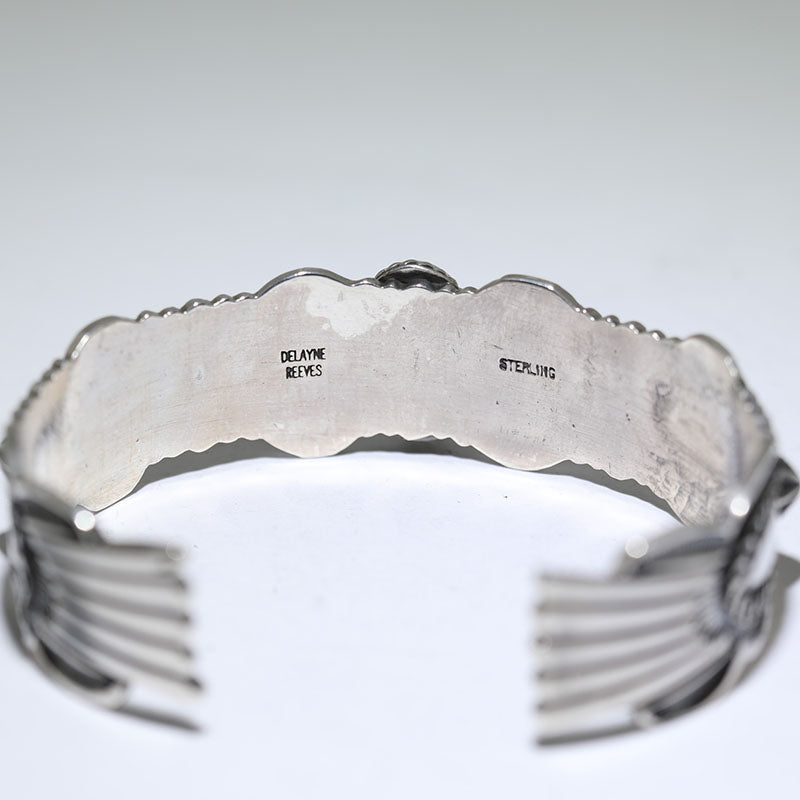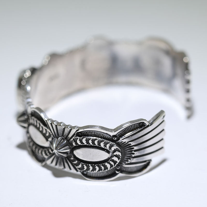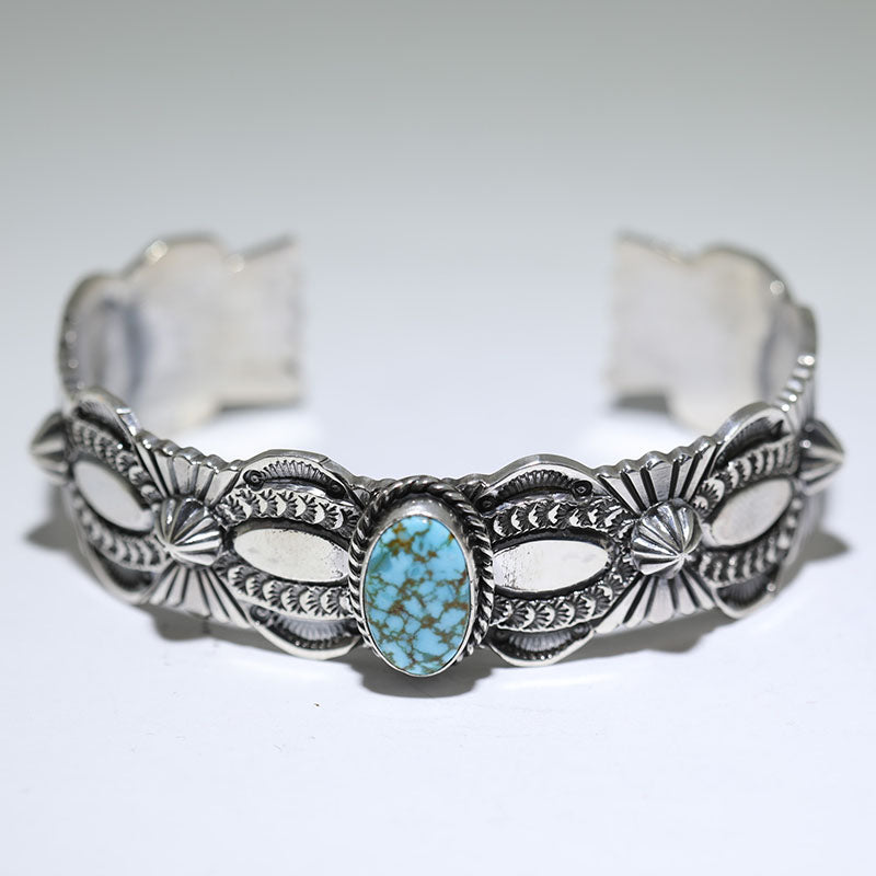 Sterling silver bracelet is set with Stabilized Kingman Turquoise and features beautiful and detailed hand stamped designs with starbursts along the band.