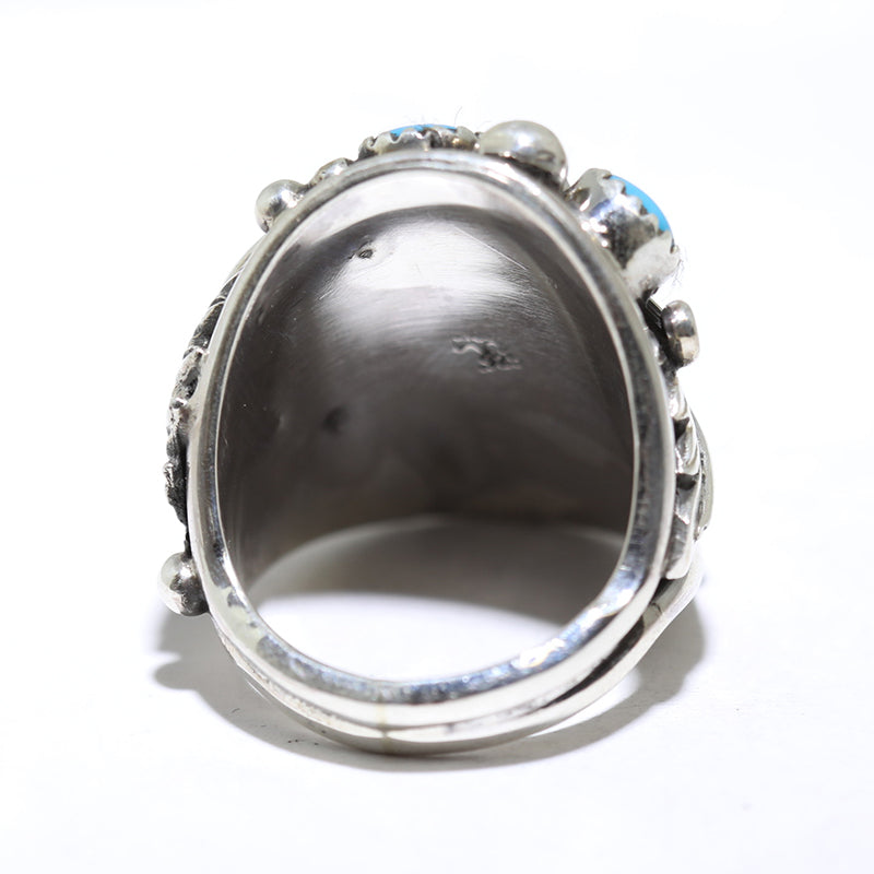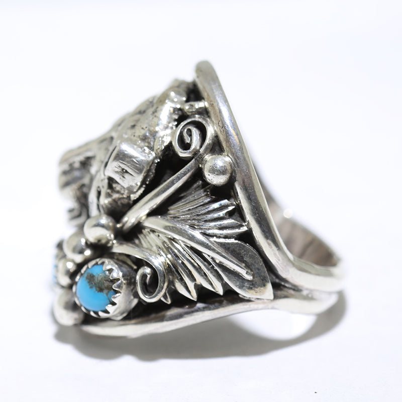 Sterling silver ring features a silver bear and leaf and is set with two little Stabilized Kingman Turquoise stones at the bottom.