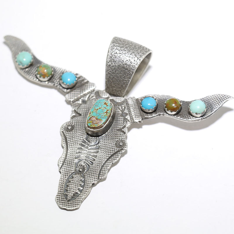 Sterling silver pendant is shaped like a Longhorn with hand stamped designs and is set with Stabilized Sonoran Gold Turquoise.