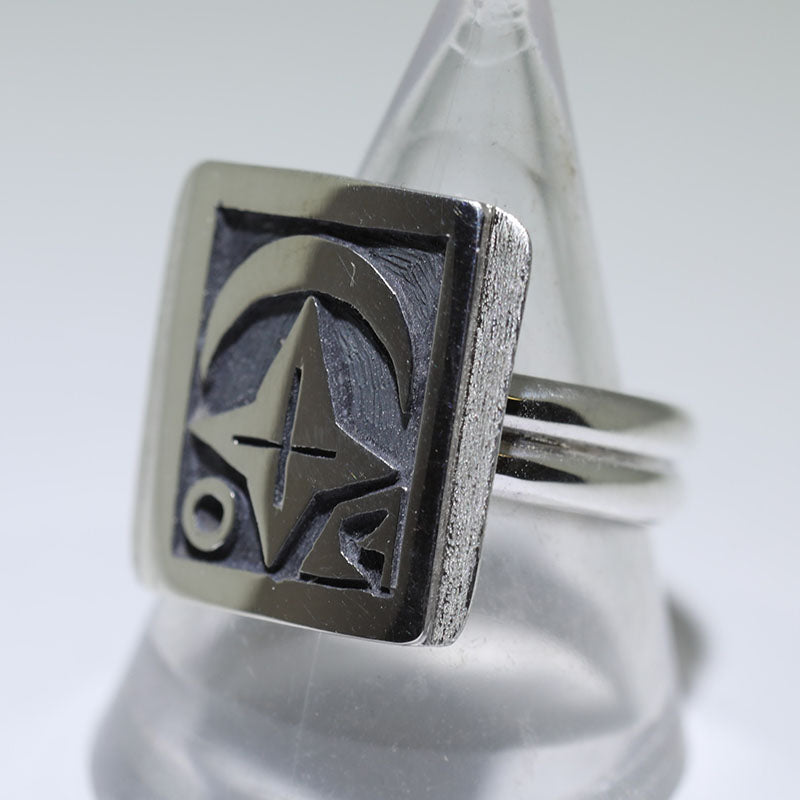 Sterling silver ring is done in the overlay technique and features the Moon and a Star. Each detail is but by hand.