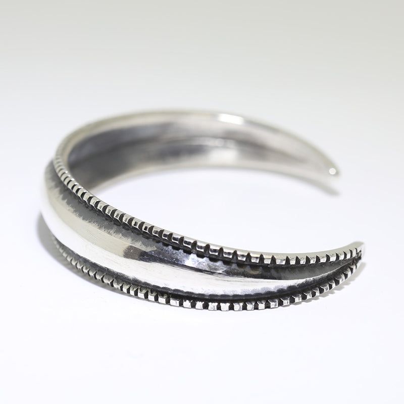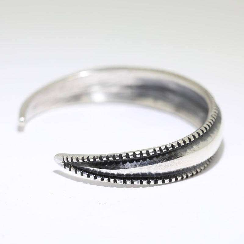 Sterling silver bracelet features shiny silver in the center with hand stamped edges along the band.