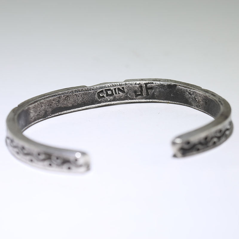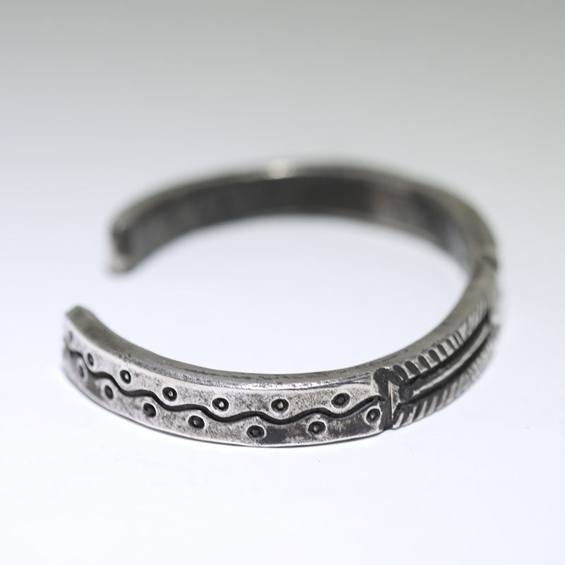 Coin silver bracelet features hand filed and stamped designs across the band with a diamond in the center.