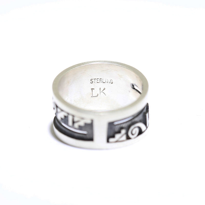 Beautiful sterling silver ring is done in the overlay technique and features the Sun Face in the center with Hopi designs on the sides. Each detail is cut by hand.