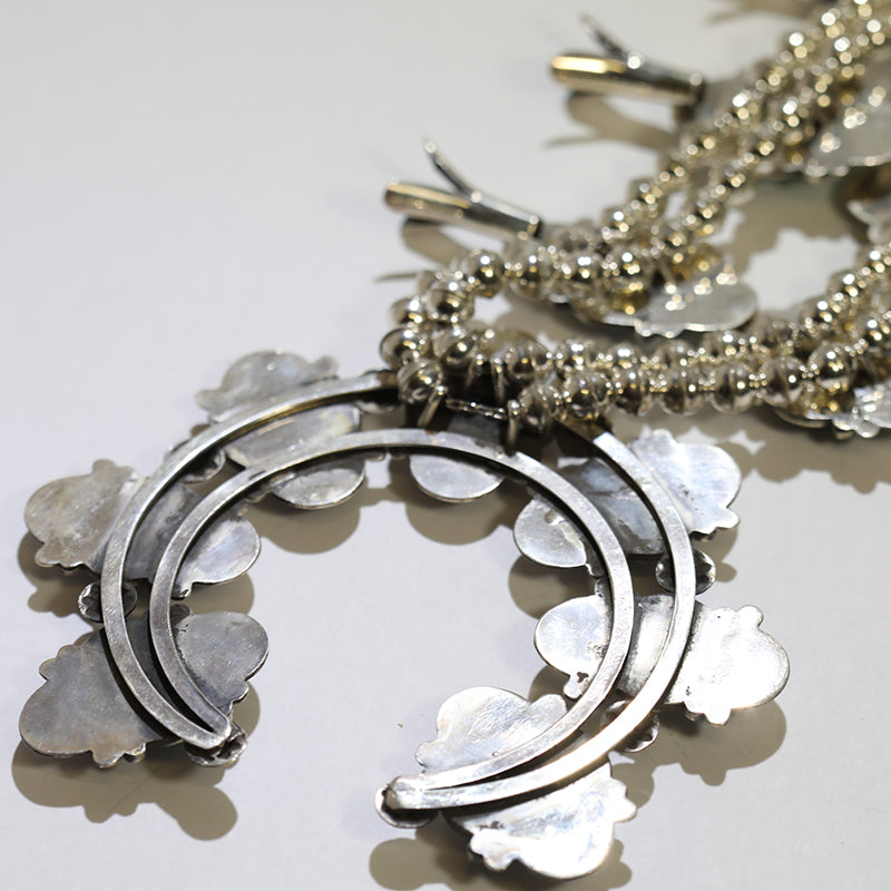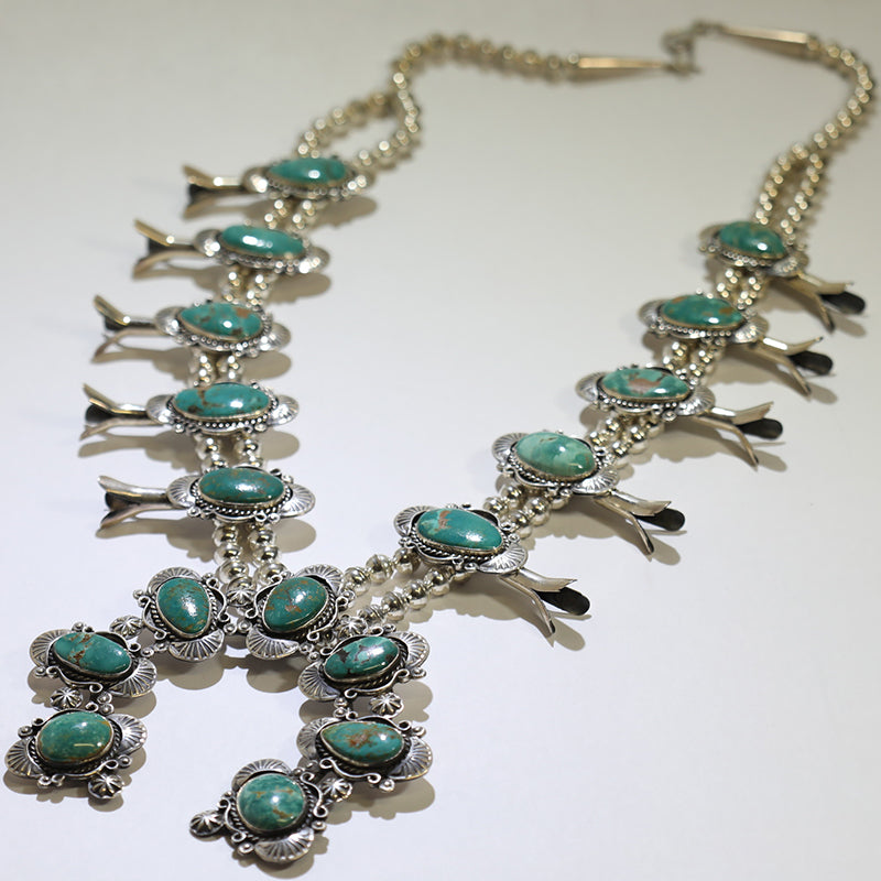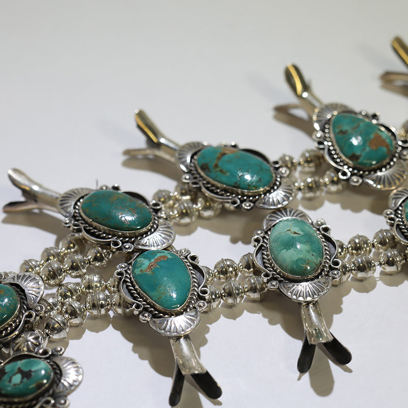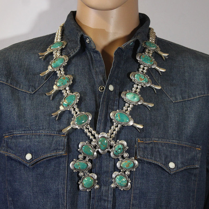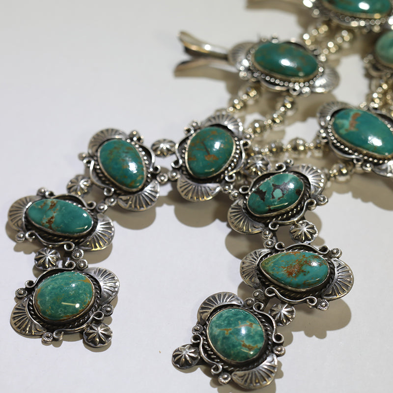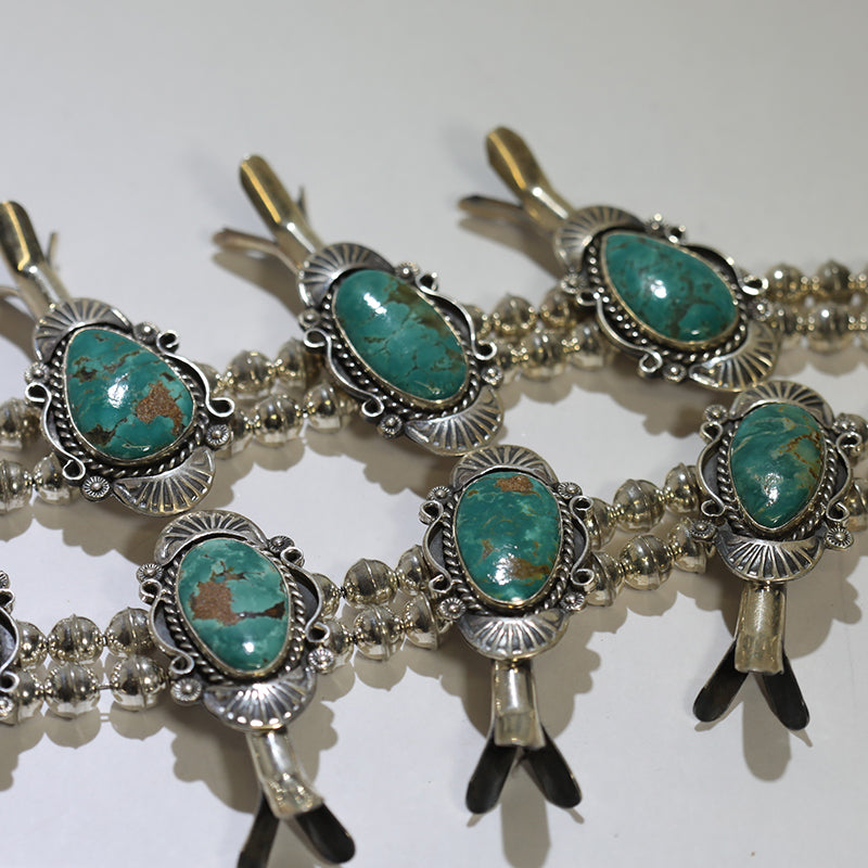 Beautiful, handmade sterling silver Squash Blossom Necklace is set with Stabilize Tyrone Turquoise stones which features hand stamped edges.