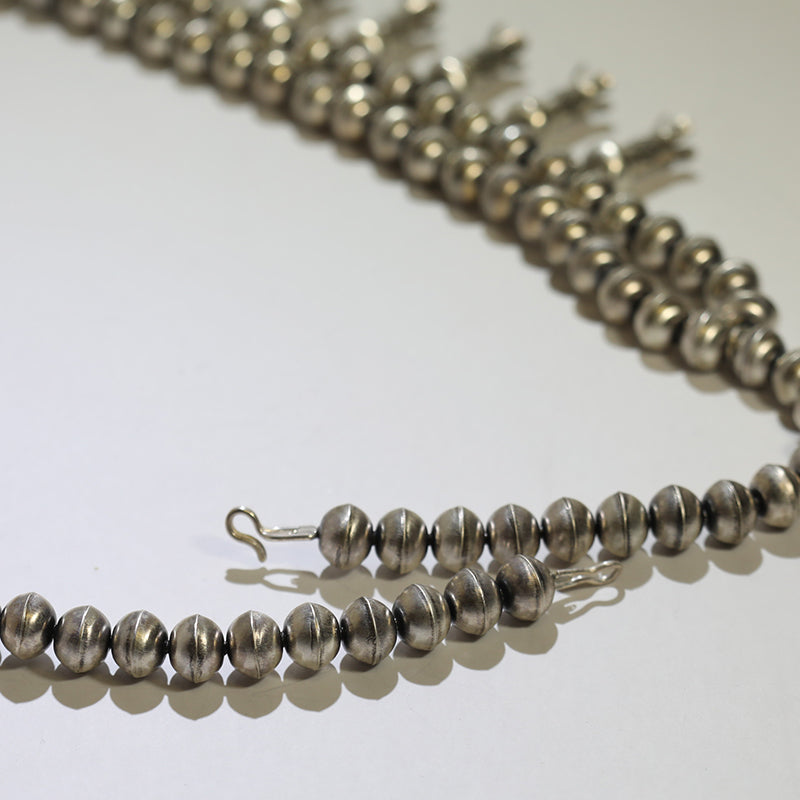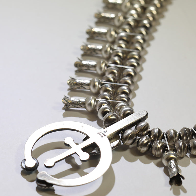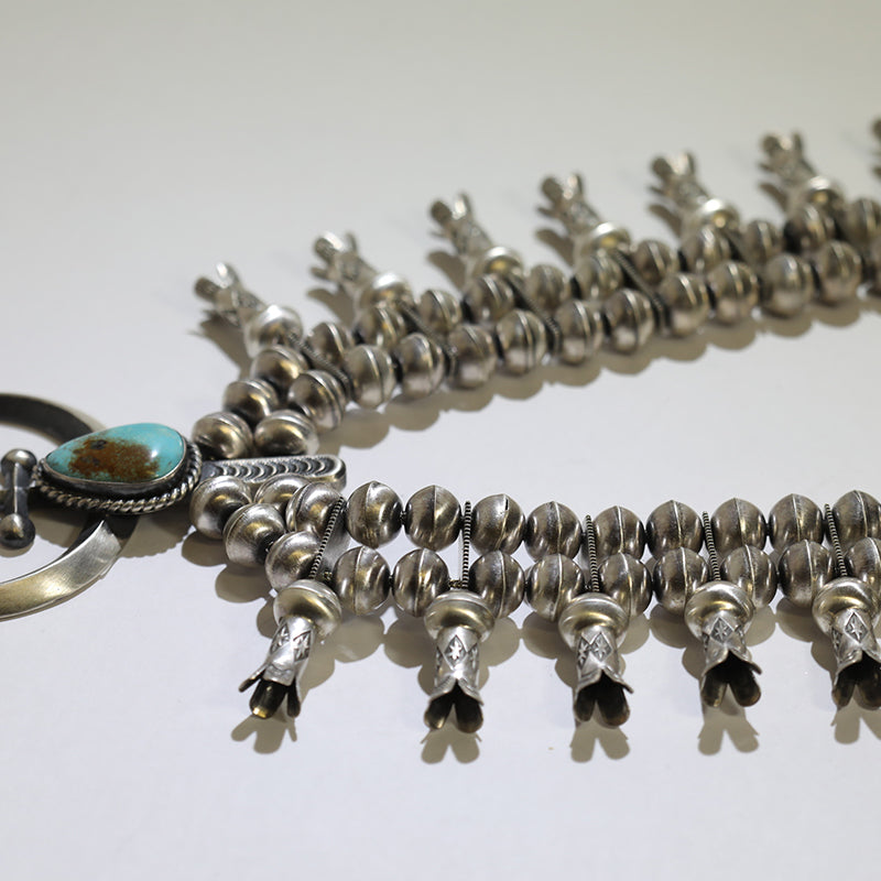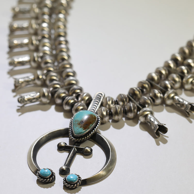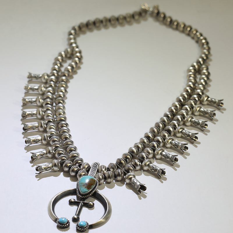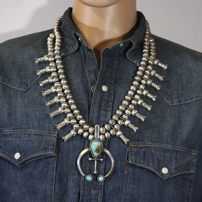 Beautiful, handmade sterling silver Squash Blossom Necklace is set with Stabilized Kingman Turquoise stones which features hand stamped designs.