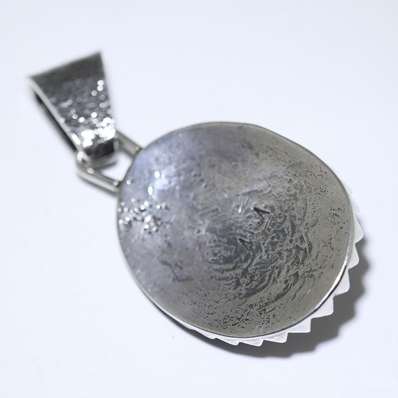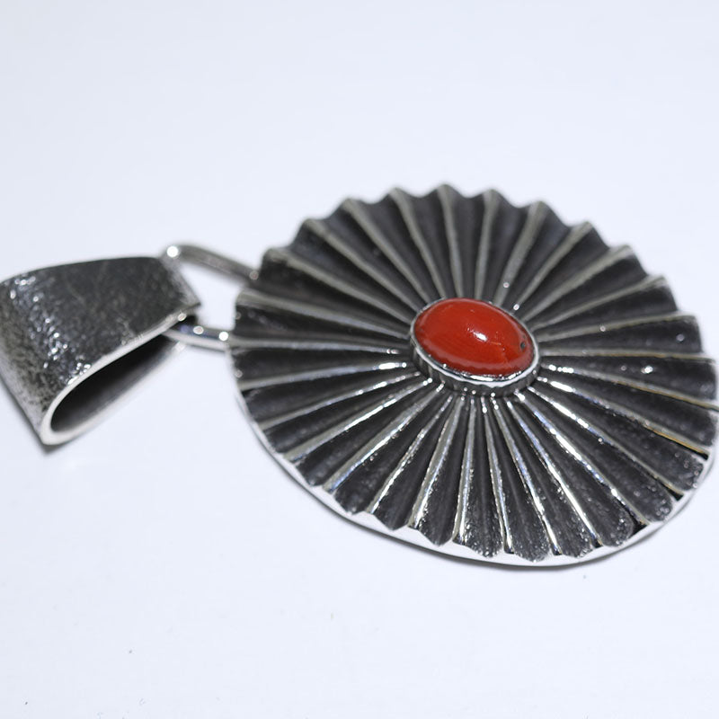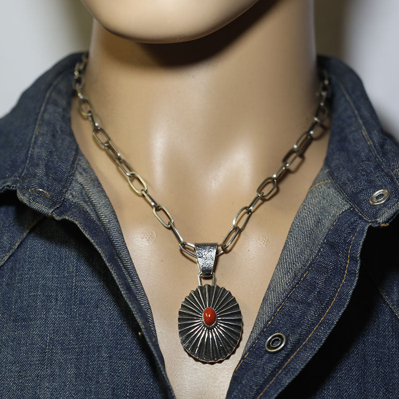 Beautiful sterling silver pendant is hand carved and created using the Tufa Cast method which is oval shaped and set with natural Coral stone.
