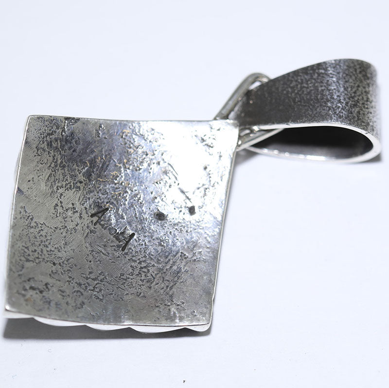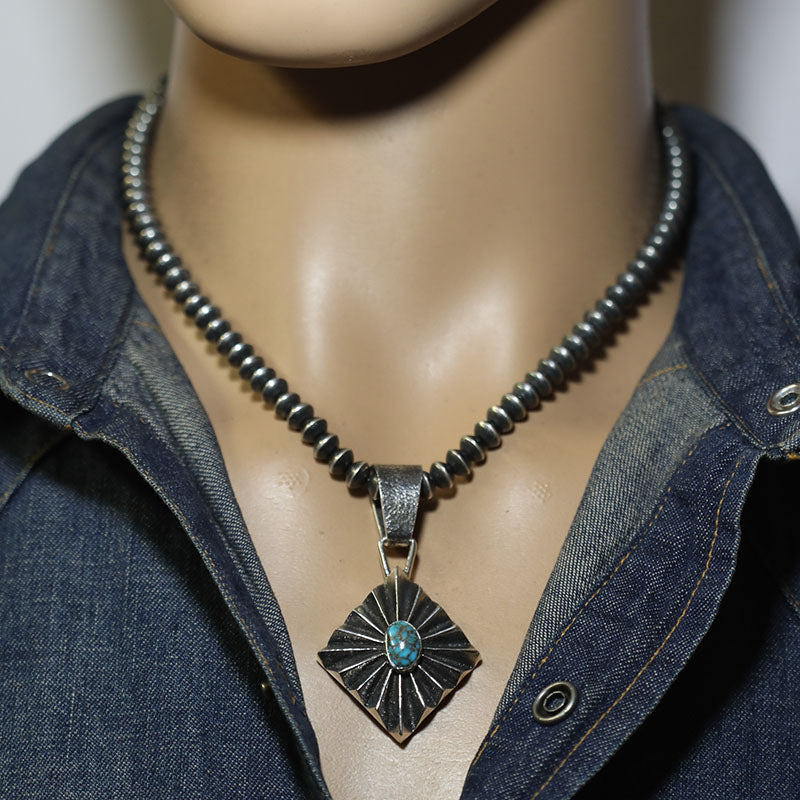 Beautiful sterling silver pendant is hand carved and created using the Tufa Cast method which is diamond shaped and set with Lone Mountain Turquoise.