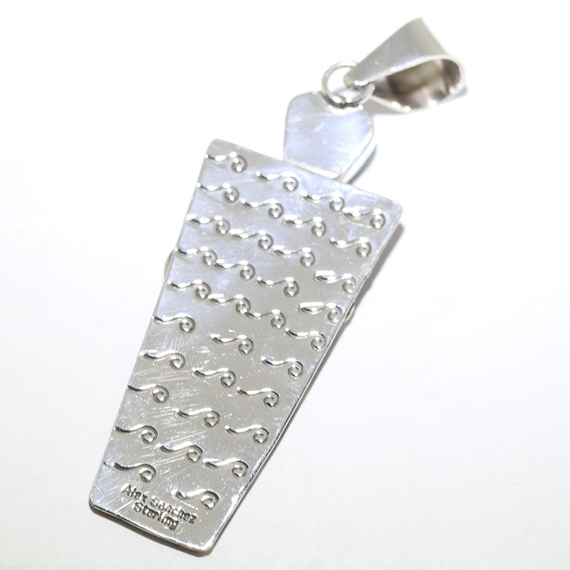 Beautiful sterling silver pendant features petroglyph designs and is set with Stabilized Kingman Turquoise at the top center.