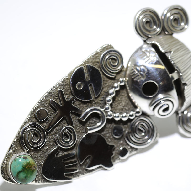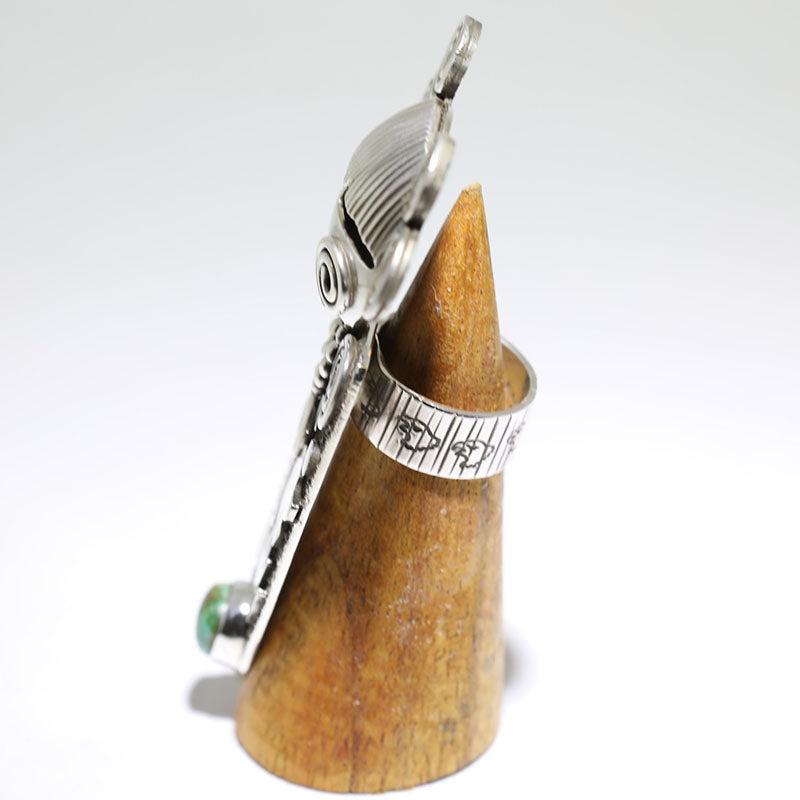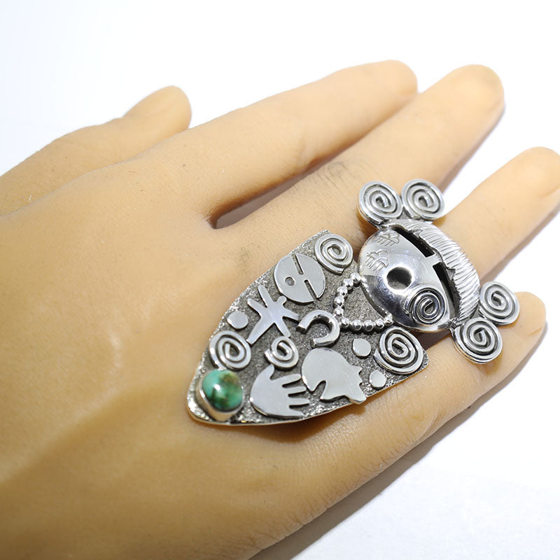 Beautiful sterling silver ring features the Maiden design with petroglyph designs along the body and set with Stabilized Sonoran Gold Turquoise at the bottom.