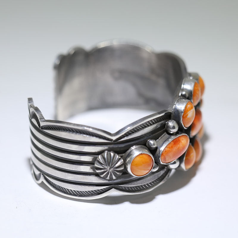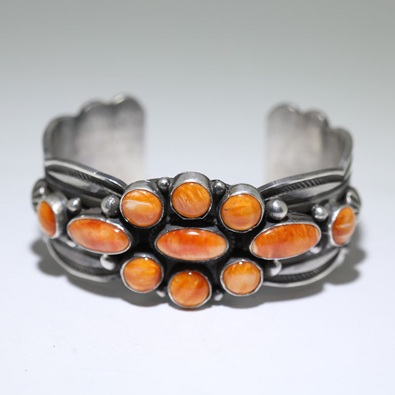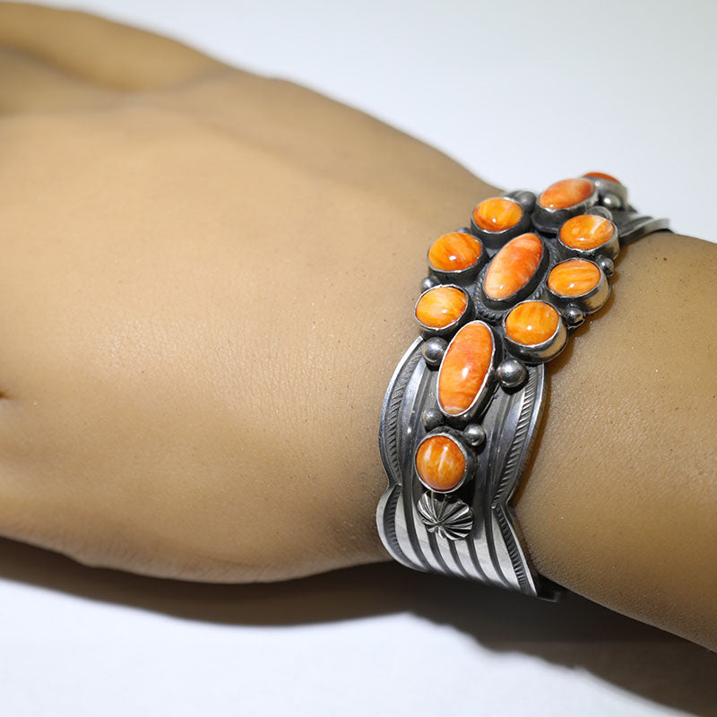 Beautiful sterling silver, cluster style bracelet is set with orange Spiny Oyster Shell.