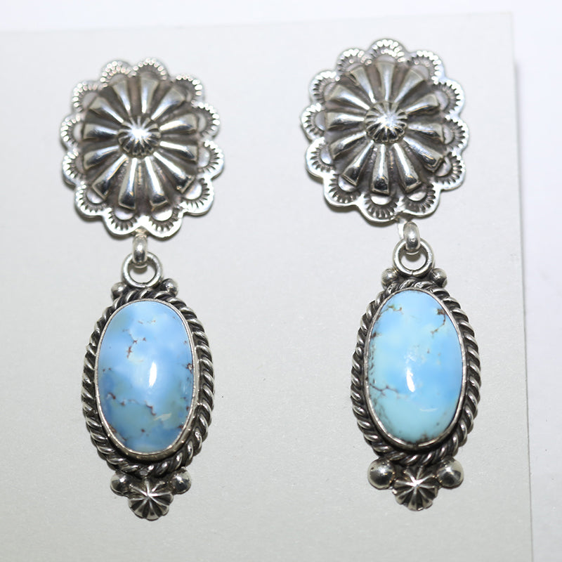 Sterling silver, dangle earrings are set with Golden Hill Turquoise which hangs from a silver flower shaped post.