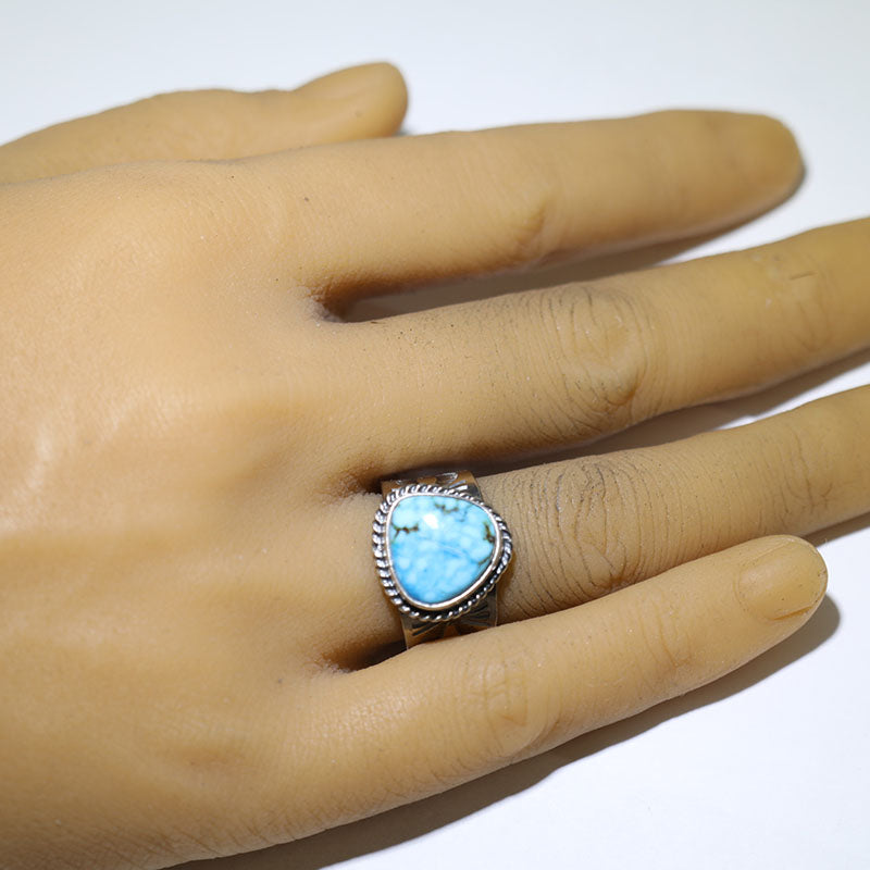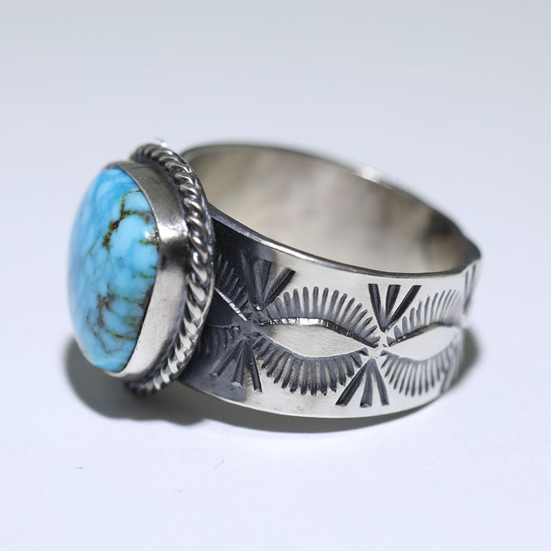 Sterling silver ring features hand stamped designs and is set with Stabilized Kingman Turquoise.