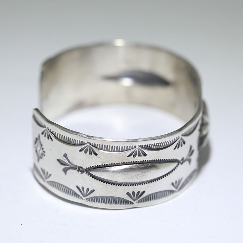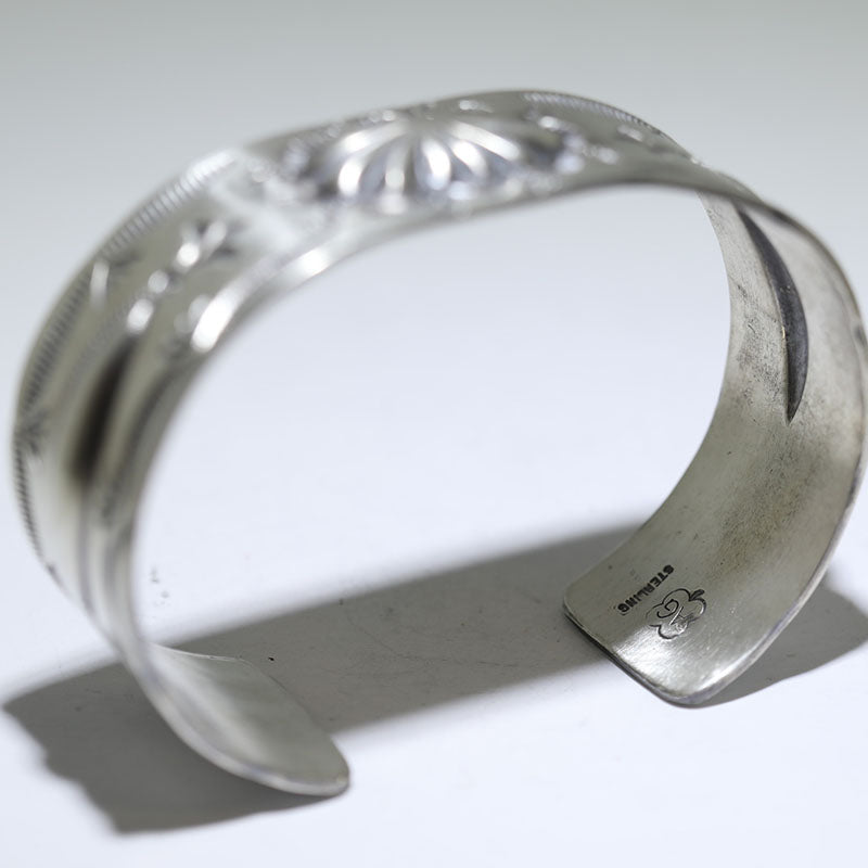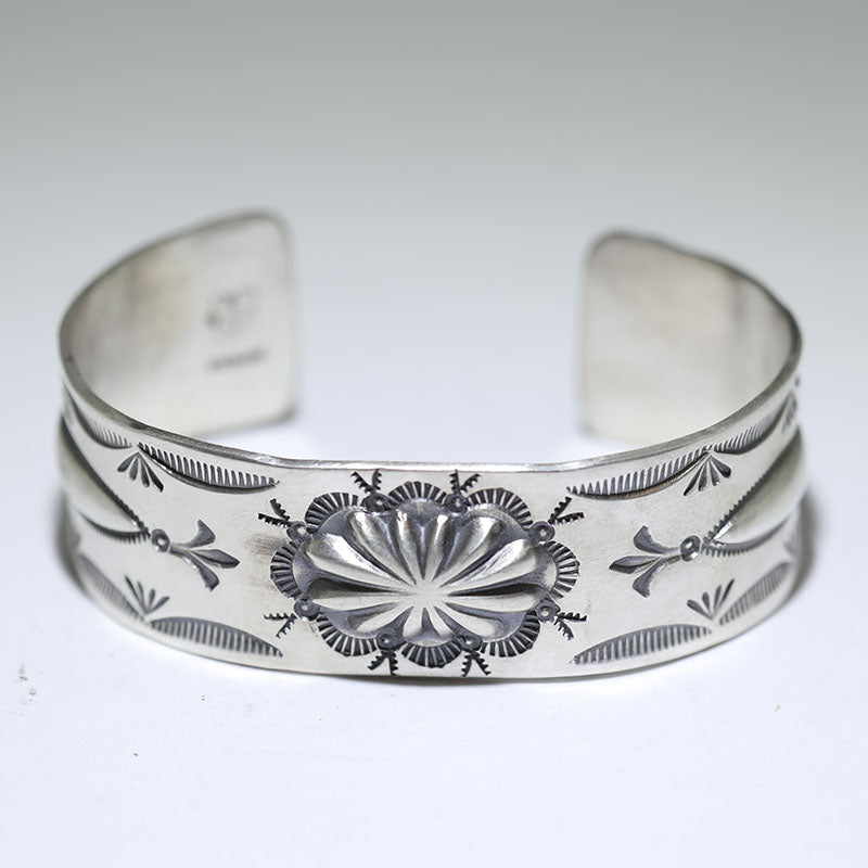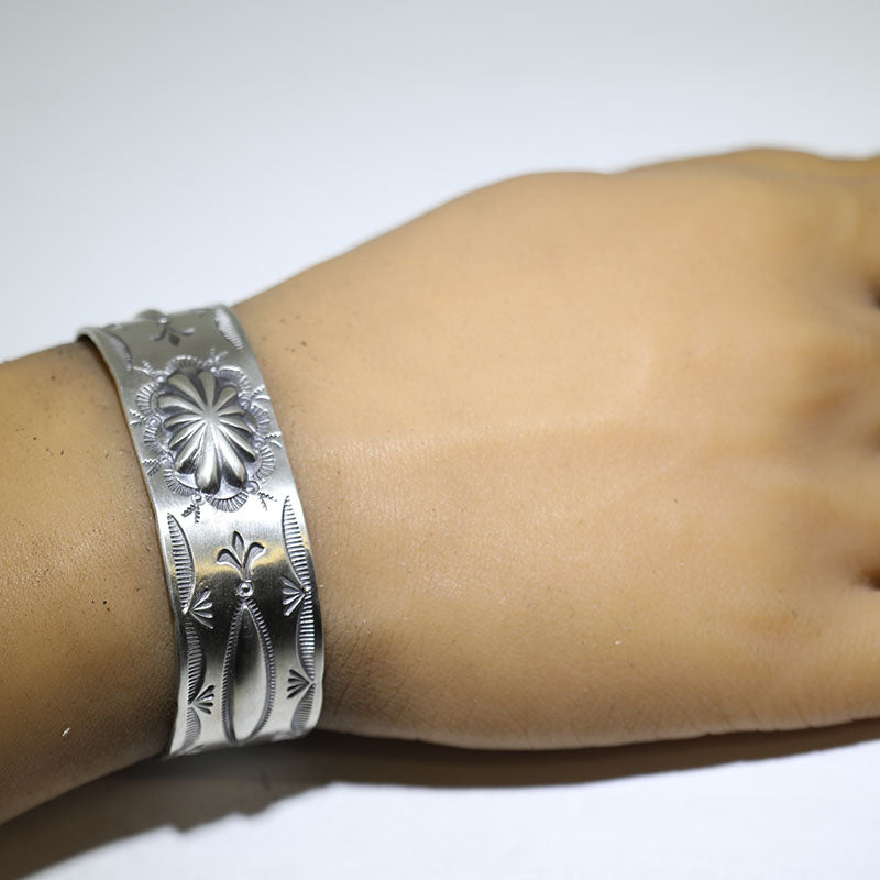 Sterling silver bracelet features a flower bump out in the center with hand stamped designs and bump outs along the band.