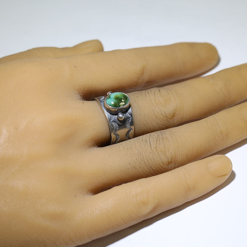 Sterling silver ring features hand stamped designs and is set with Stabilized Sonoran Turquoise with a silver bead on each side.