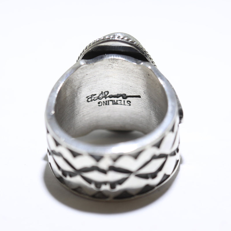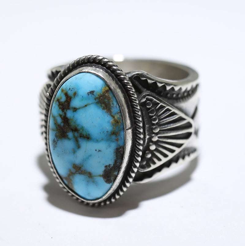 Sterling silver ring features detailed hand stamped designs along the band and is set with Stabilized Kingman Turquoise.