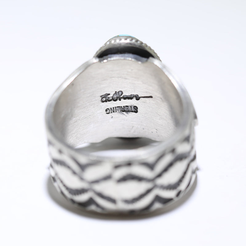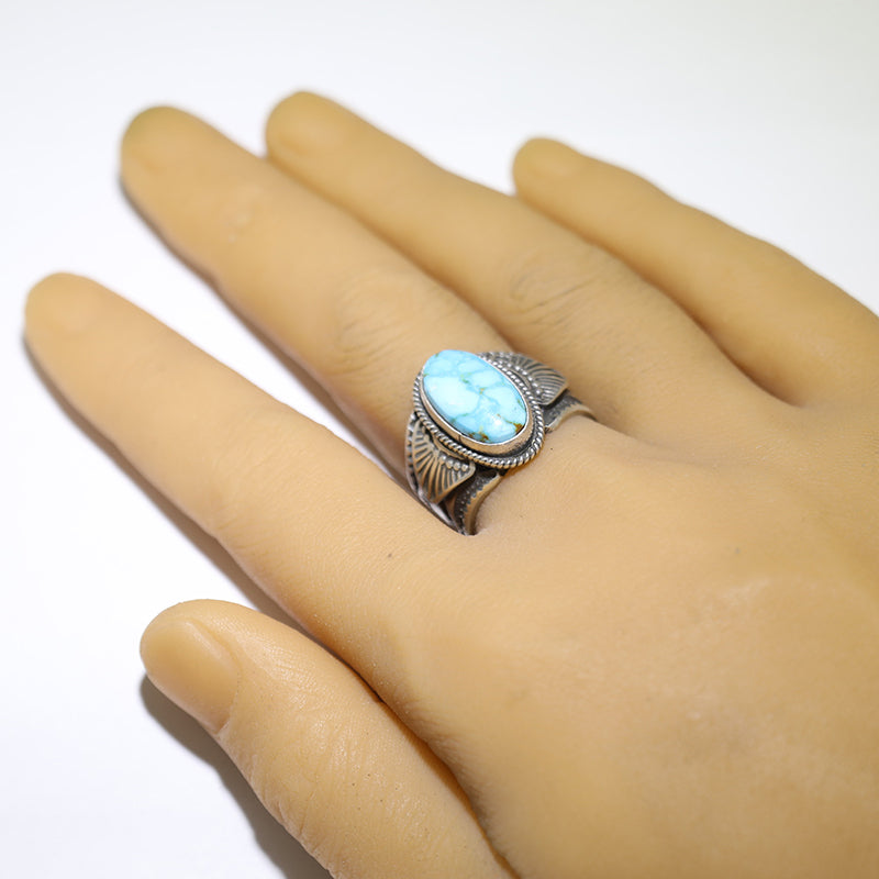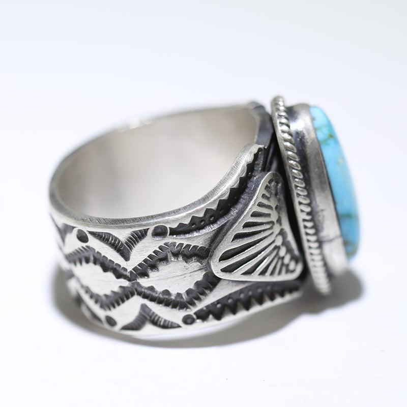Sterling silver ring features detailed hand stamped designs along the band and is set with Stabilized Kingman Turquoise.