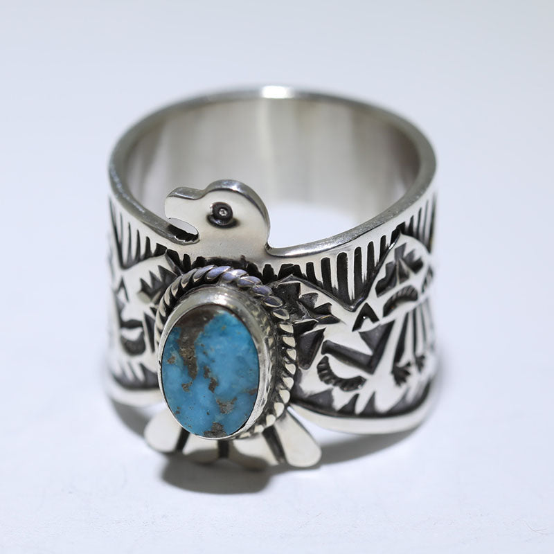 Beautiful sterling silver ring is shaped like the Thunderbird which has hand stamped designs and is set with Stabilized Kingman Turquoise.