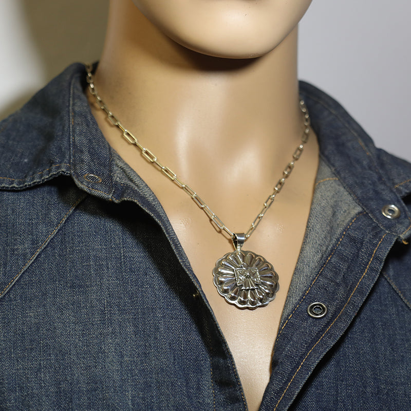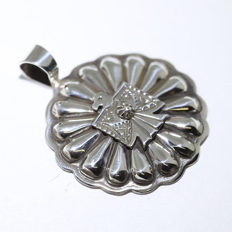 Sterling silver pendant is concho shaped and features bump out designs with a hand stamped Thunderbird in the center.