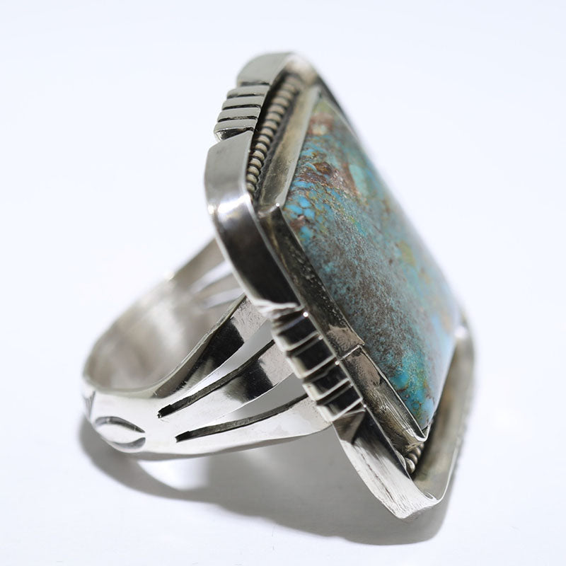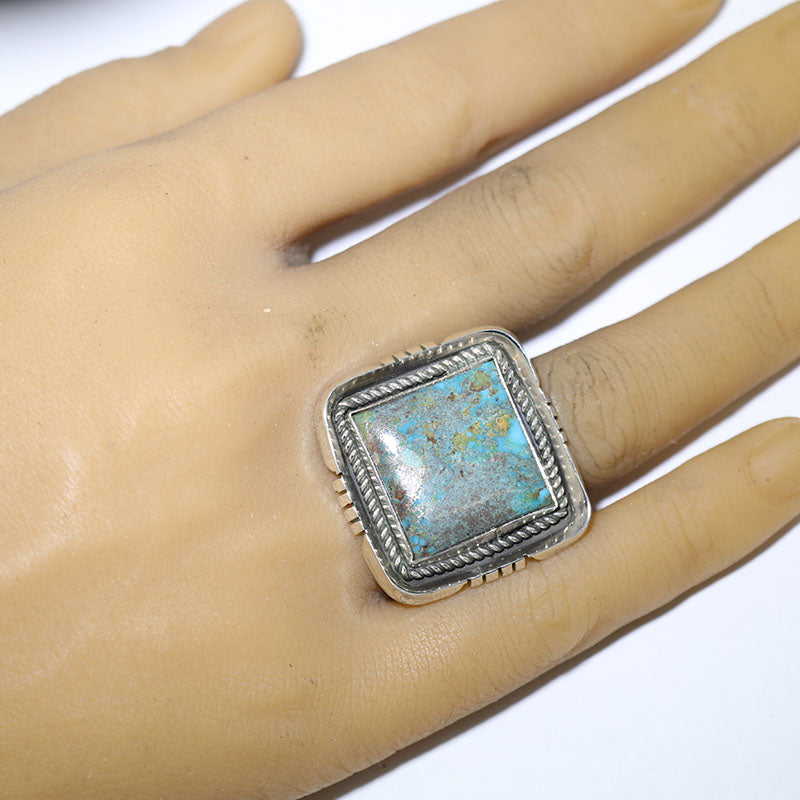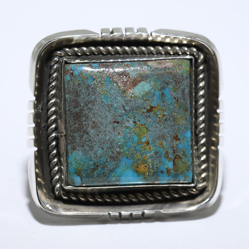 Sterling silver ring is set with Natural Bisbee Turquoise and features a silver border around the stone.