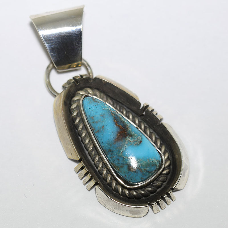 Sterling silver pendant is set with Natural Bisbee Turquoise and features a silver border around the stone.