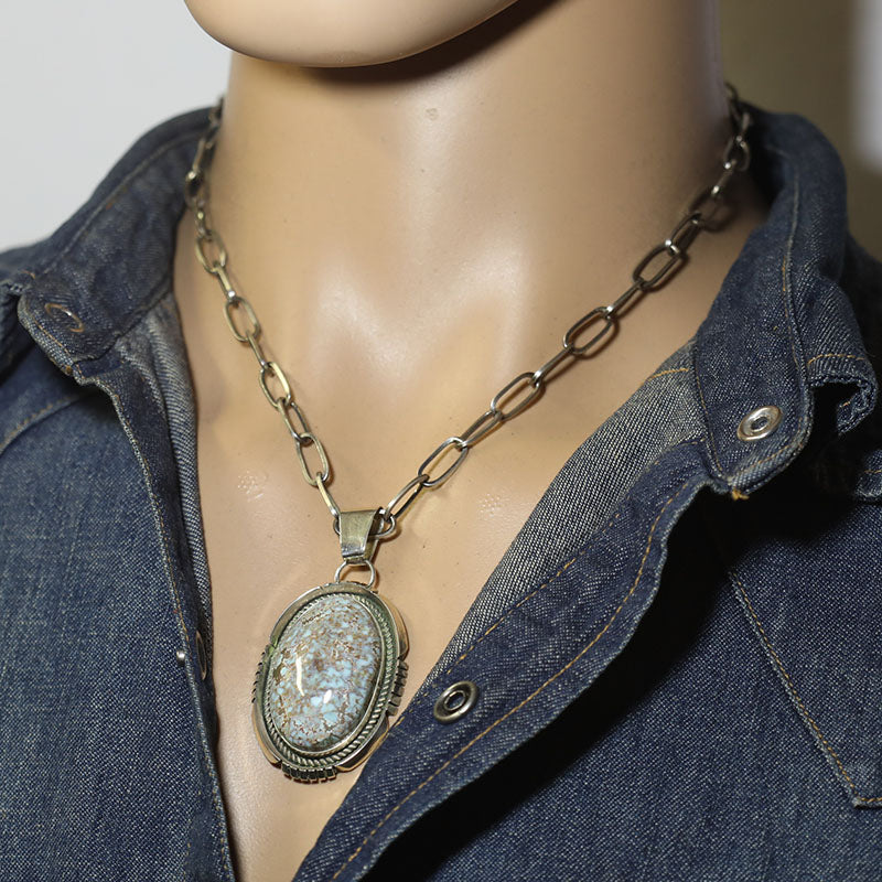 Sterling silver pendant is set with Dry Creek Turquoise and features a silver border around the stone.