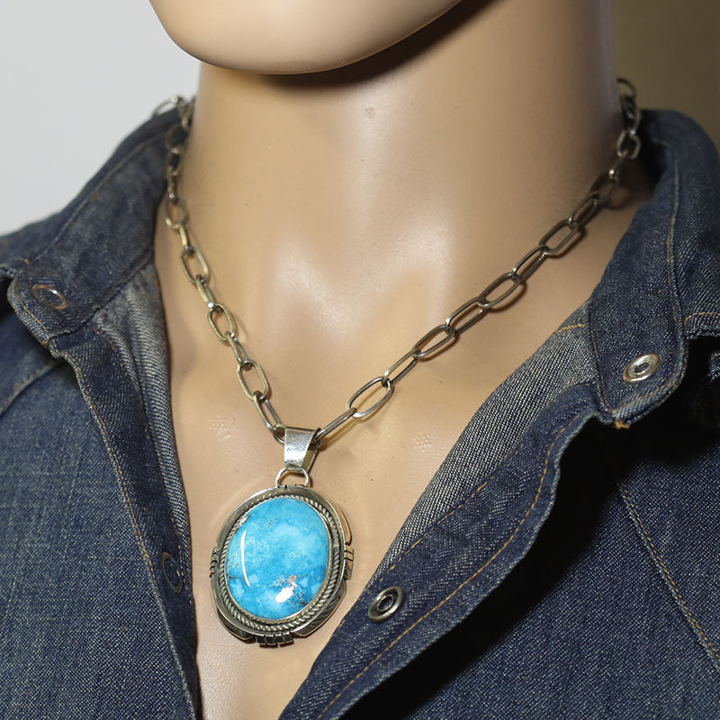 Sterling silver pendant is set with Stabilized Egyptian Turquoise and features a silver border around the stone.